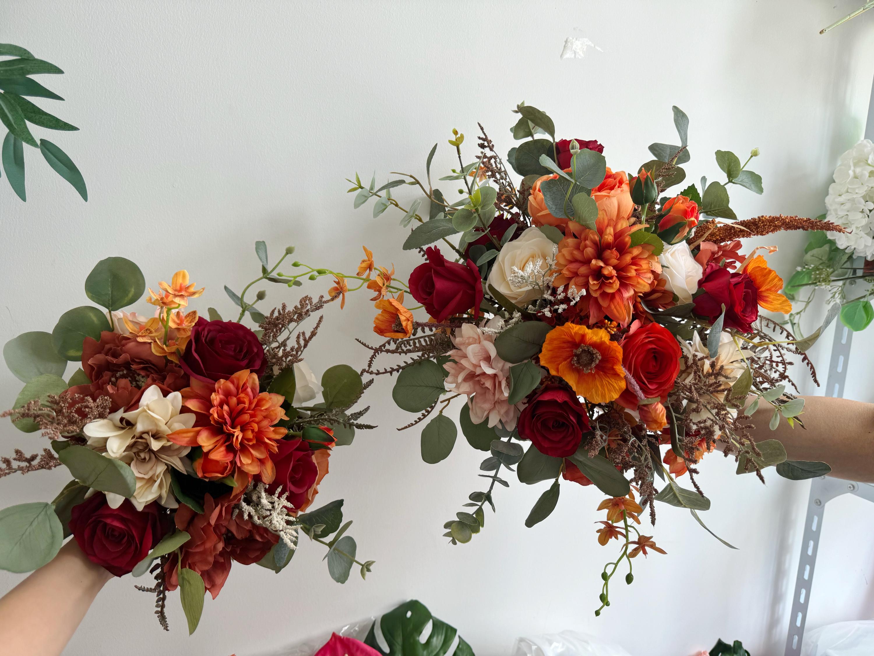 Flowers rose, peony, eucalyptus, poppy flower, dahlia, orchid, etc Colors orange, red, brown, ivory ...