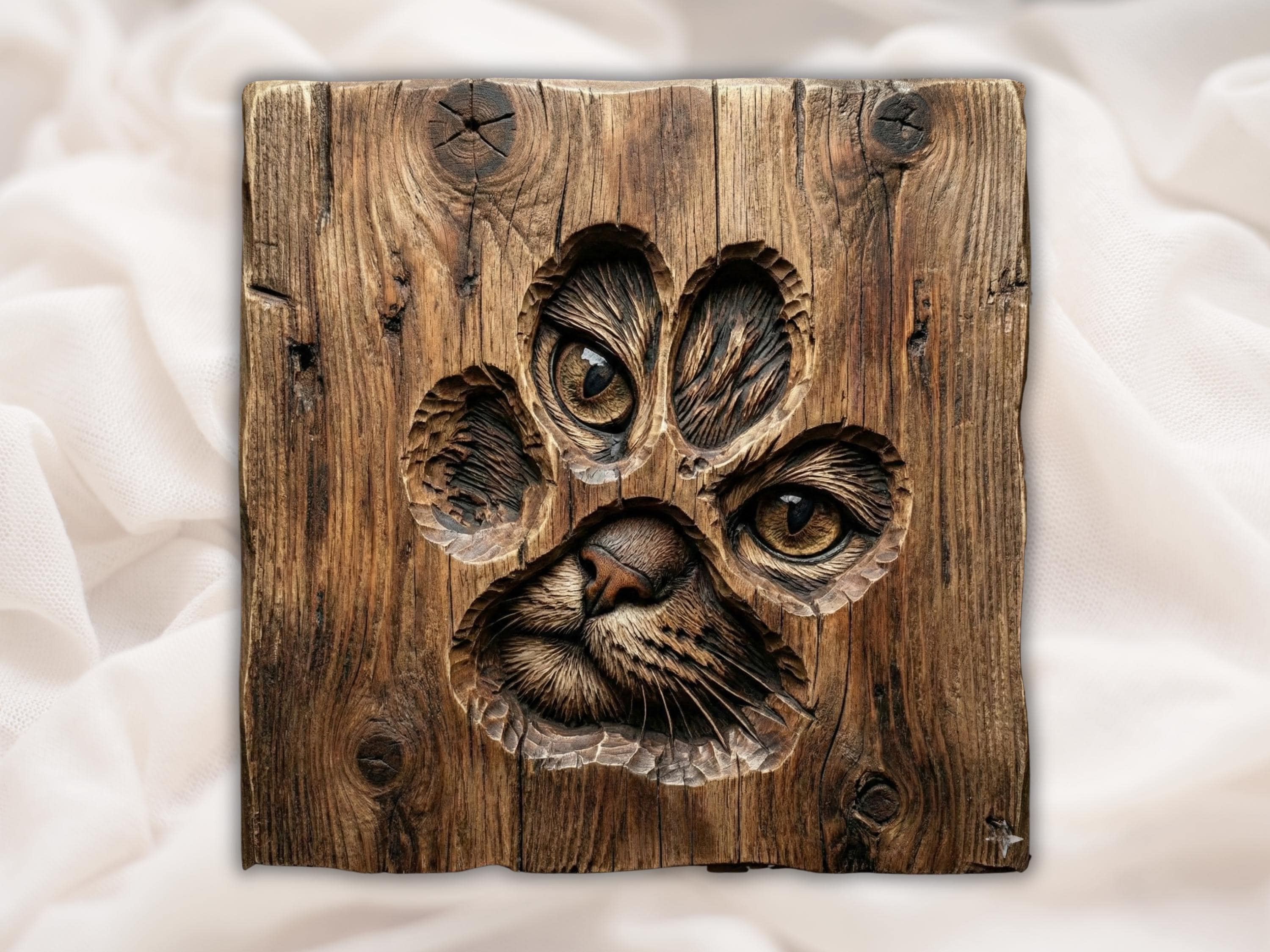Cat Paw Print 3D Relief STL File | Hidden Kitty Face Paw Wood Grain...