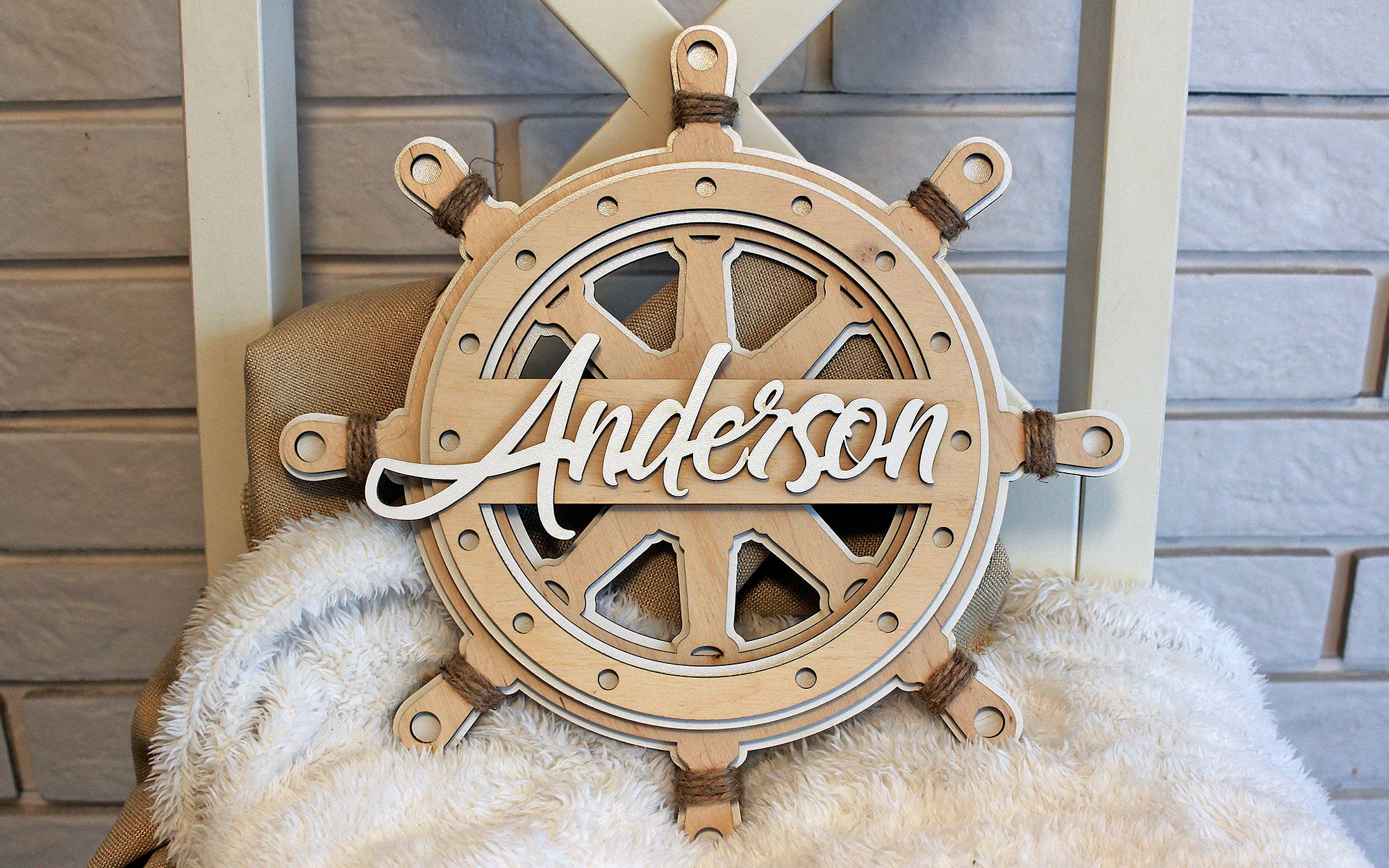 "Ship Wheel Name Sign SVG, Ships Steering Wheel Door Hanger DXF, Boat Wheel Name Sign, Pirate S...
