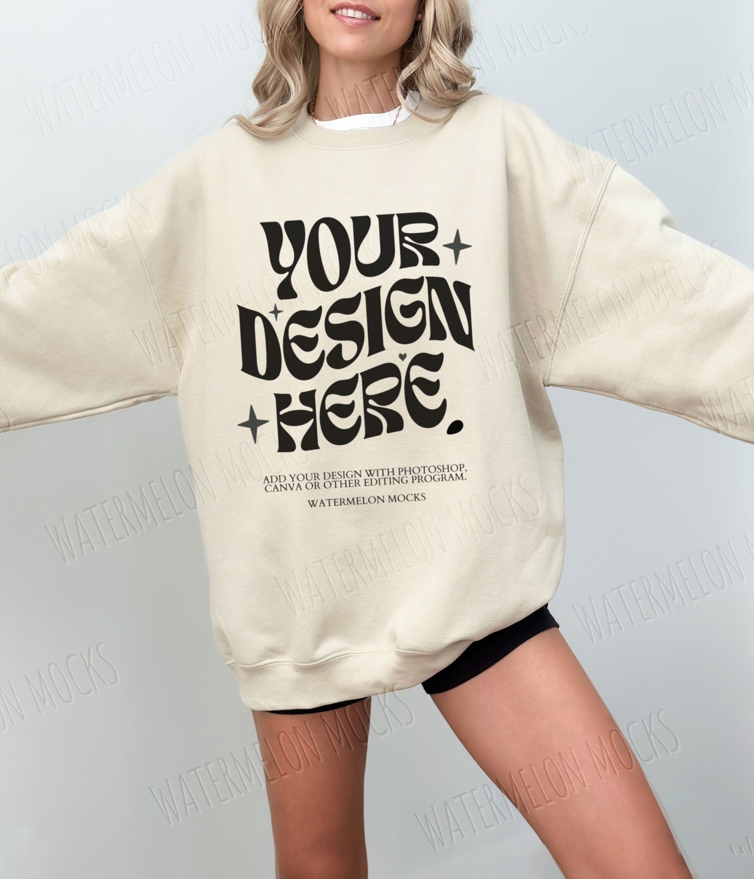 This mockup is featuring: * Gildan 18000 Sand Sweatshirt * Model is 5'8 usually size S, wearing XL P...