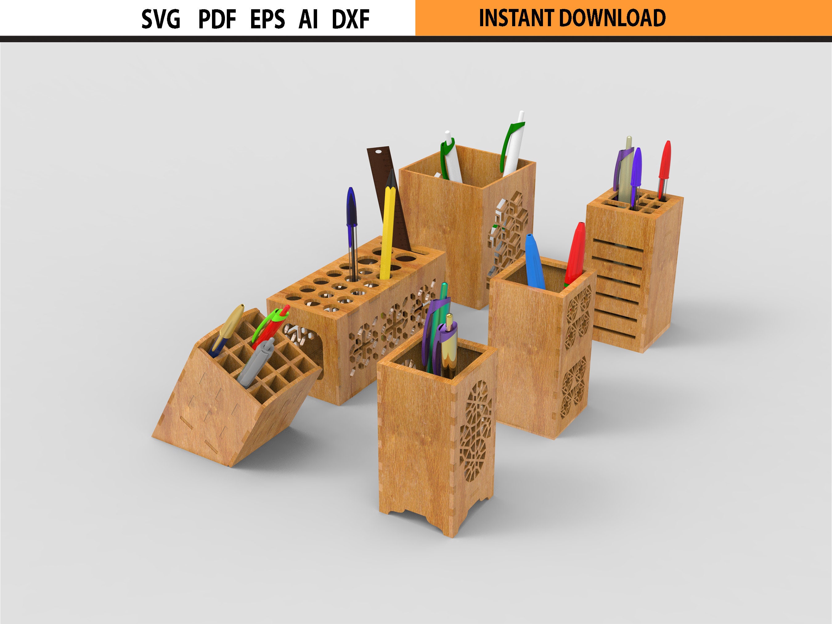 Laser Cut Desk Organizer Pencil Holder Design Bundle SVG 6Set- Laser Cut Pencil Pen Organizer- Laser...