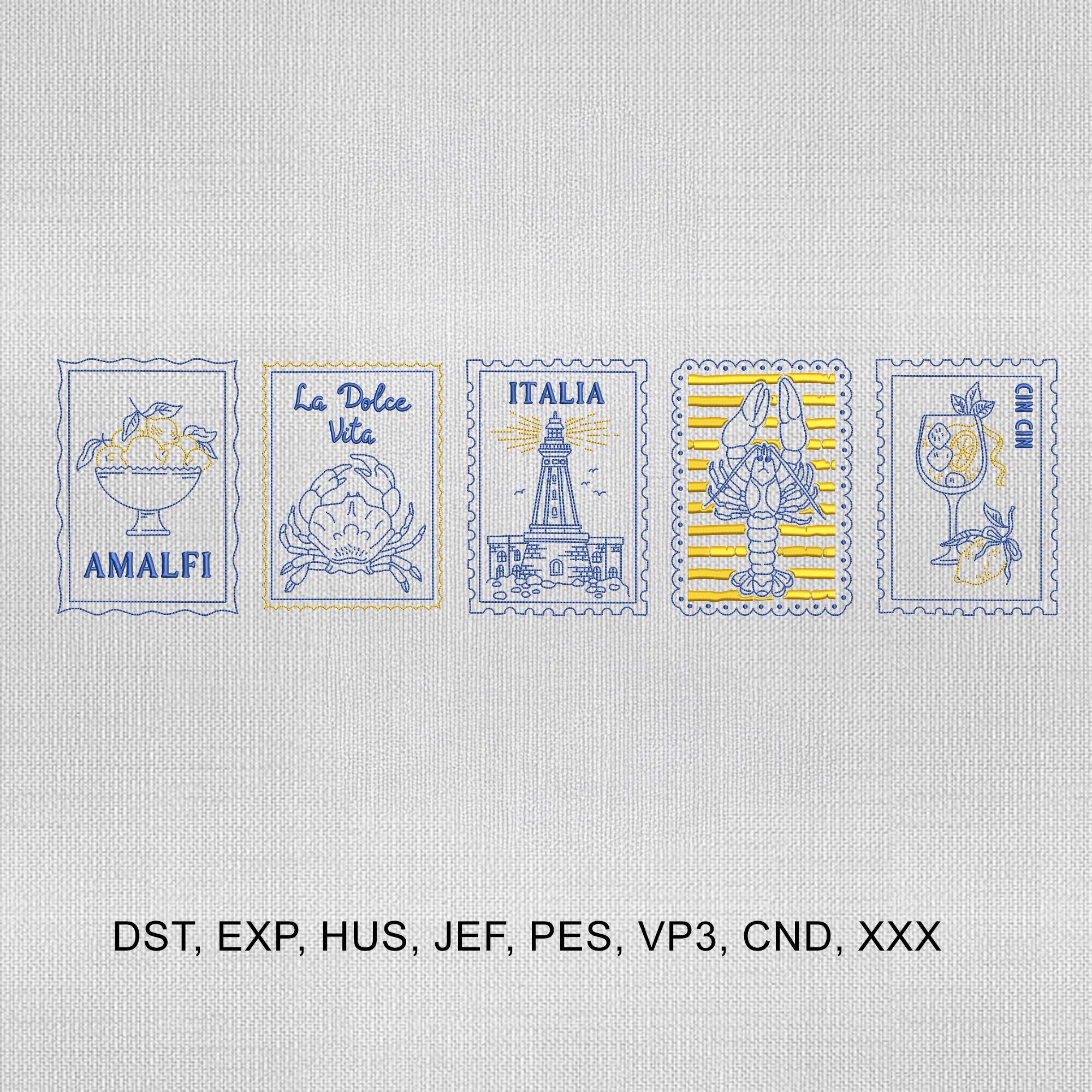 Set of 5 Italian Postage Stamps Embroidery Design,Italian Summer Th...
