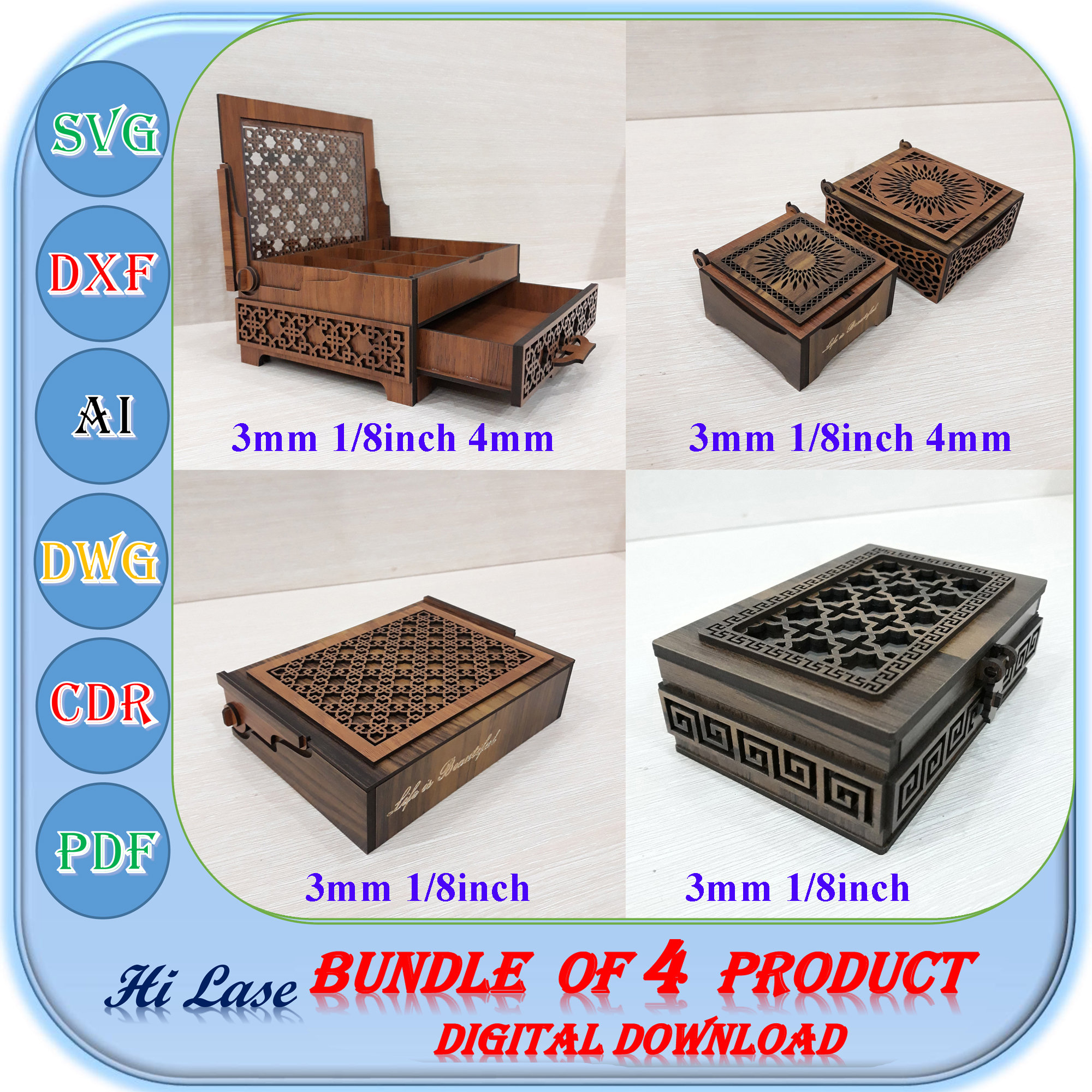 Laser Cut Wooden Box Bundle of 4 Product, 3mm 4mm 1/8 inch Wooden J...