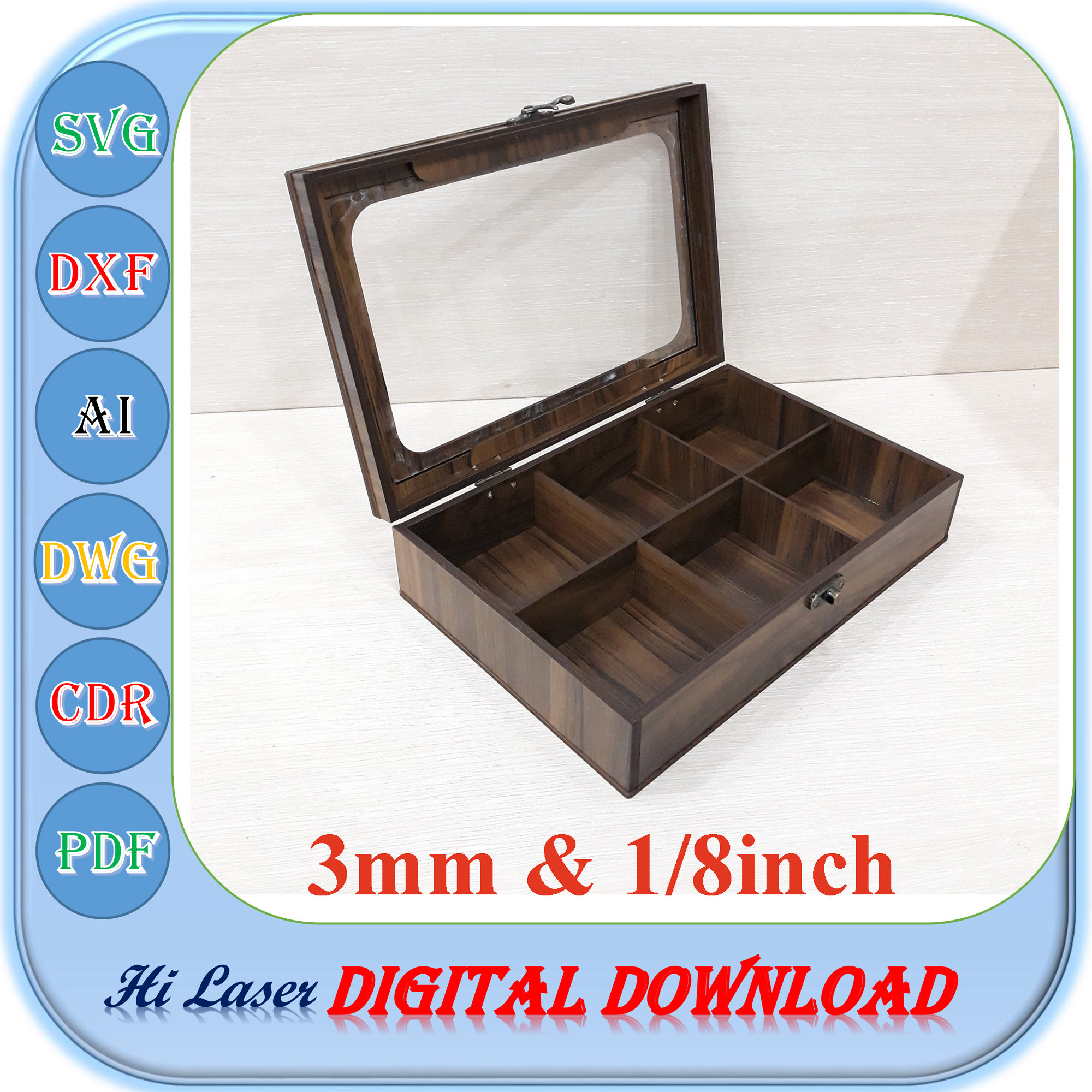 Laser Cut Wooden Box for 3mm 1/8 inch, 3mm 1/8 inch 6 Compartment T...