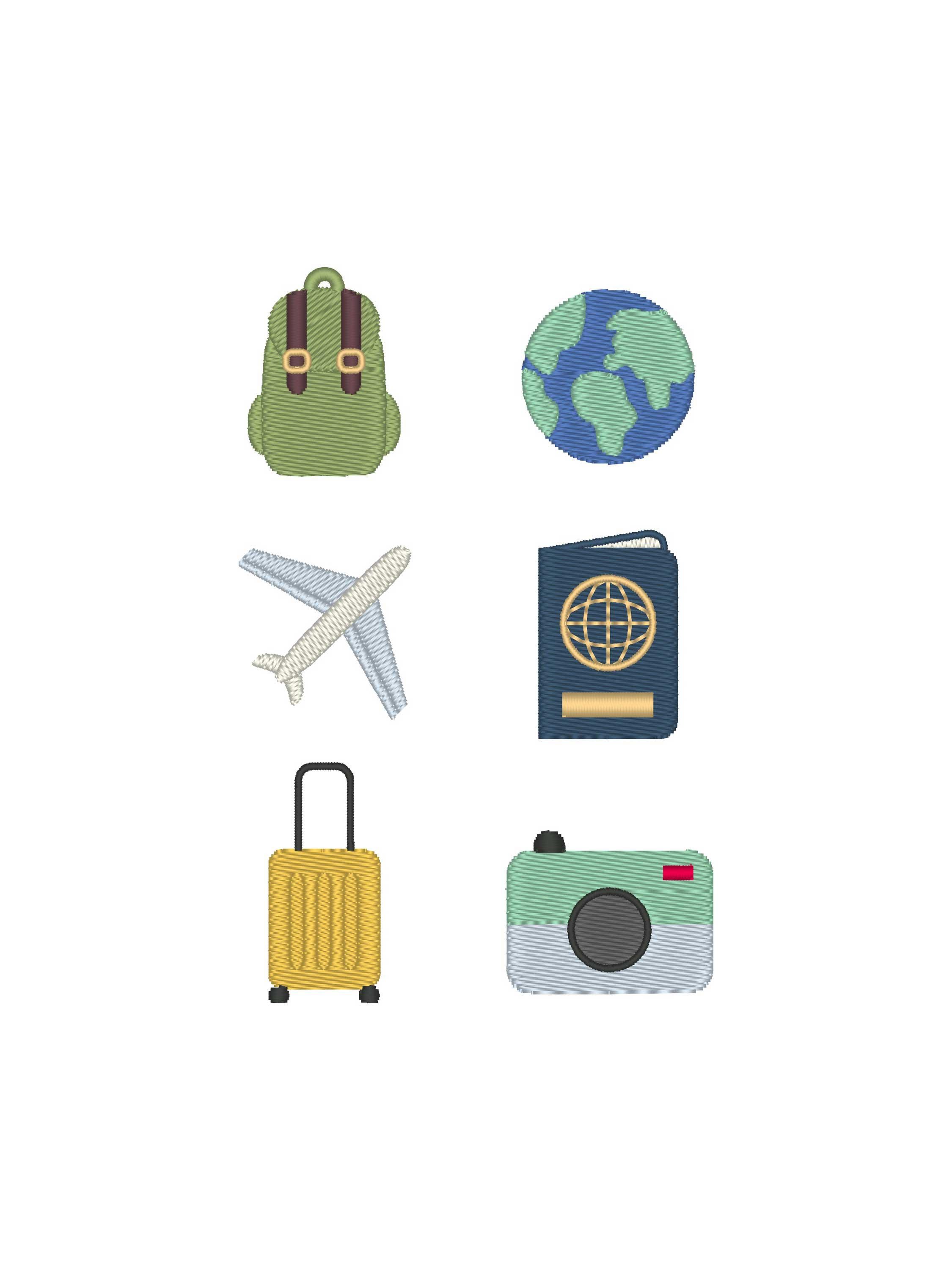 Mini Travel Embroidery Icons: Plane, Suitcase, Passport, Camera, Ba...