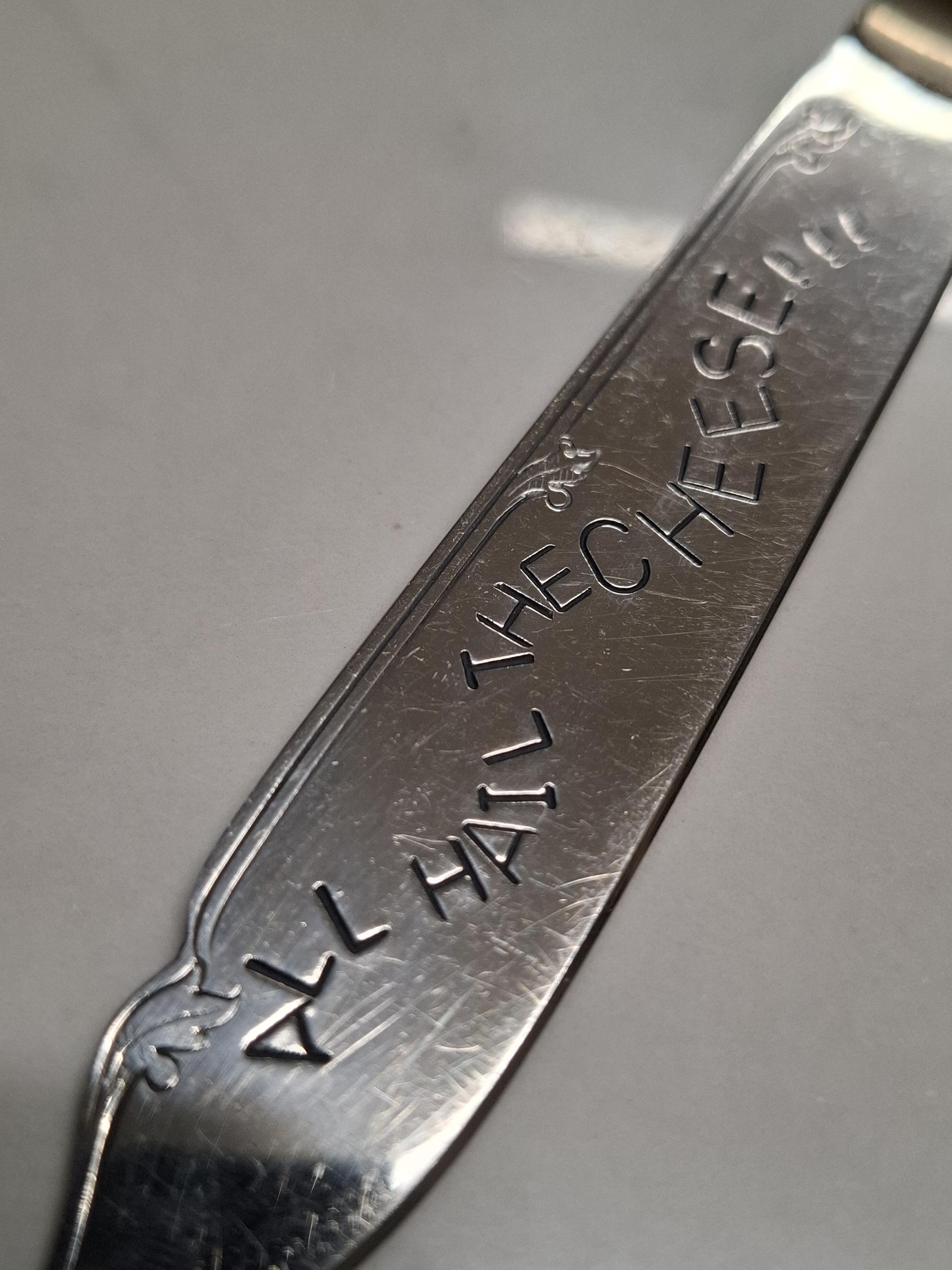 The listing is for a custom hand stamped vintage set of cheese marker forks to embellish a cheese bo...