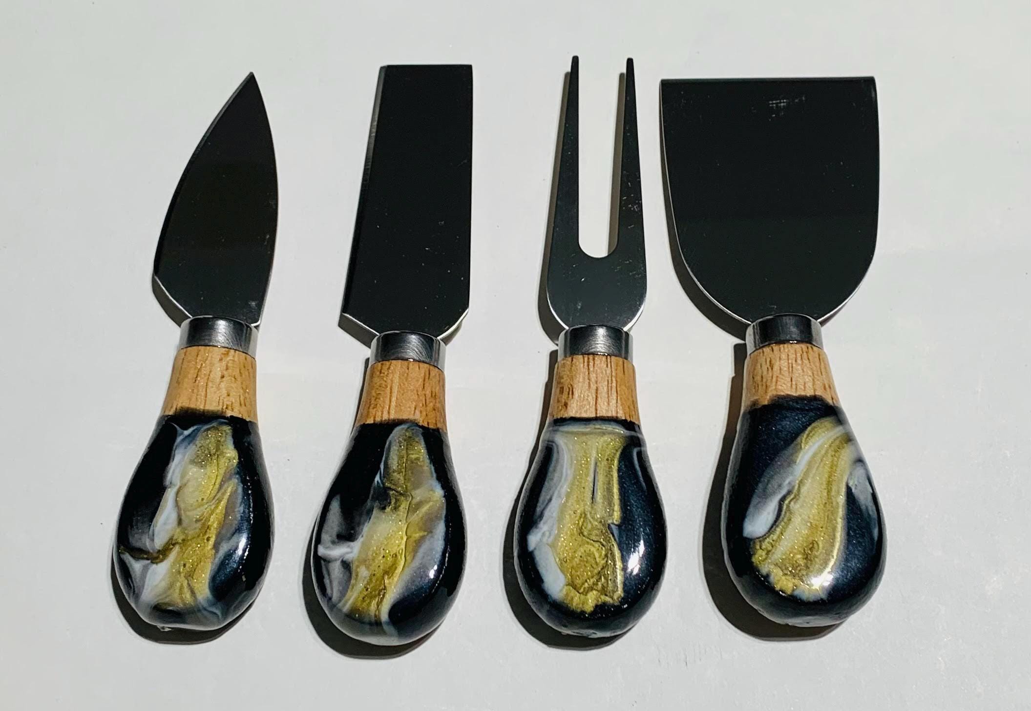 Four-piece set bamboo and epoxy resin cheese cutters. Each cheese cutter is made of high-quality str...