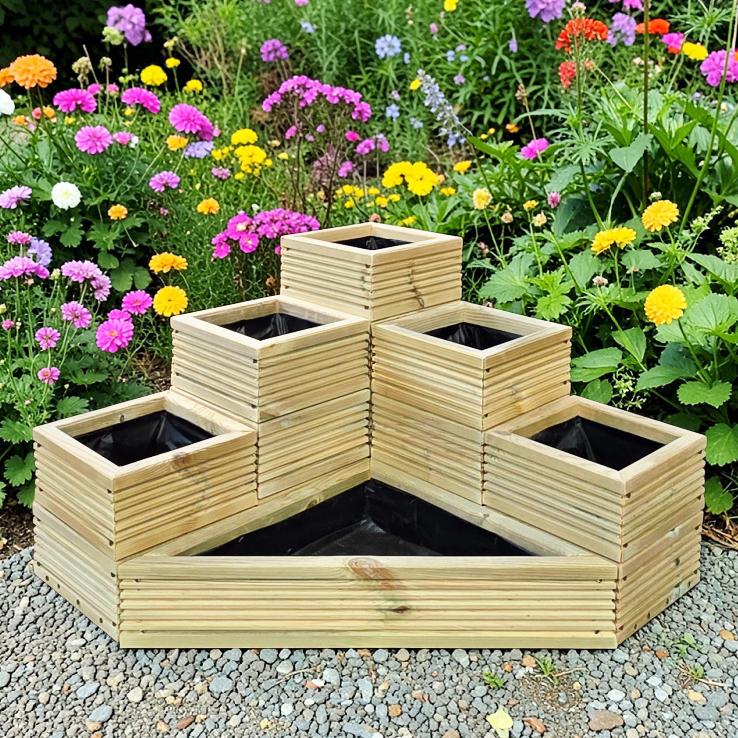 Set of 6 Individual Wooden Planters (Squares + Triangle), L Shape C...