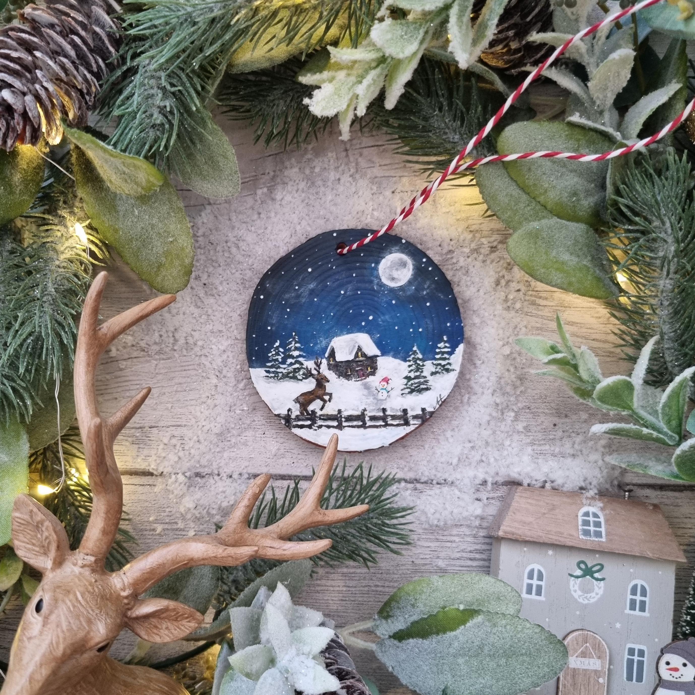 Snowy Reindeer Christmas Scene Log Slice - Christmas Log Slice Hang...