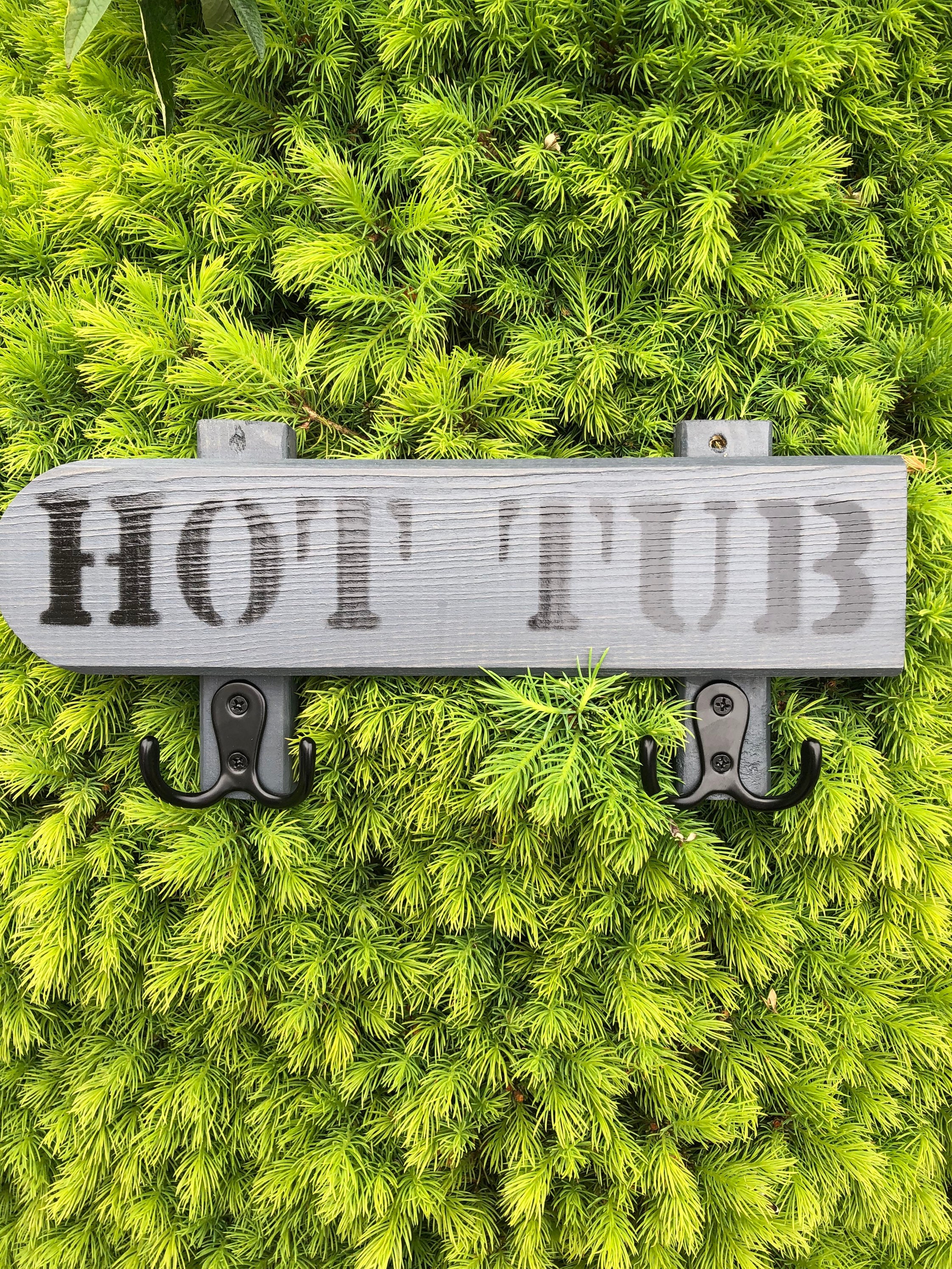 New Hot tub sign in grey with hooks for towels robe and a bottle op...