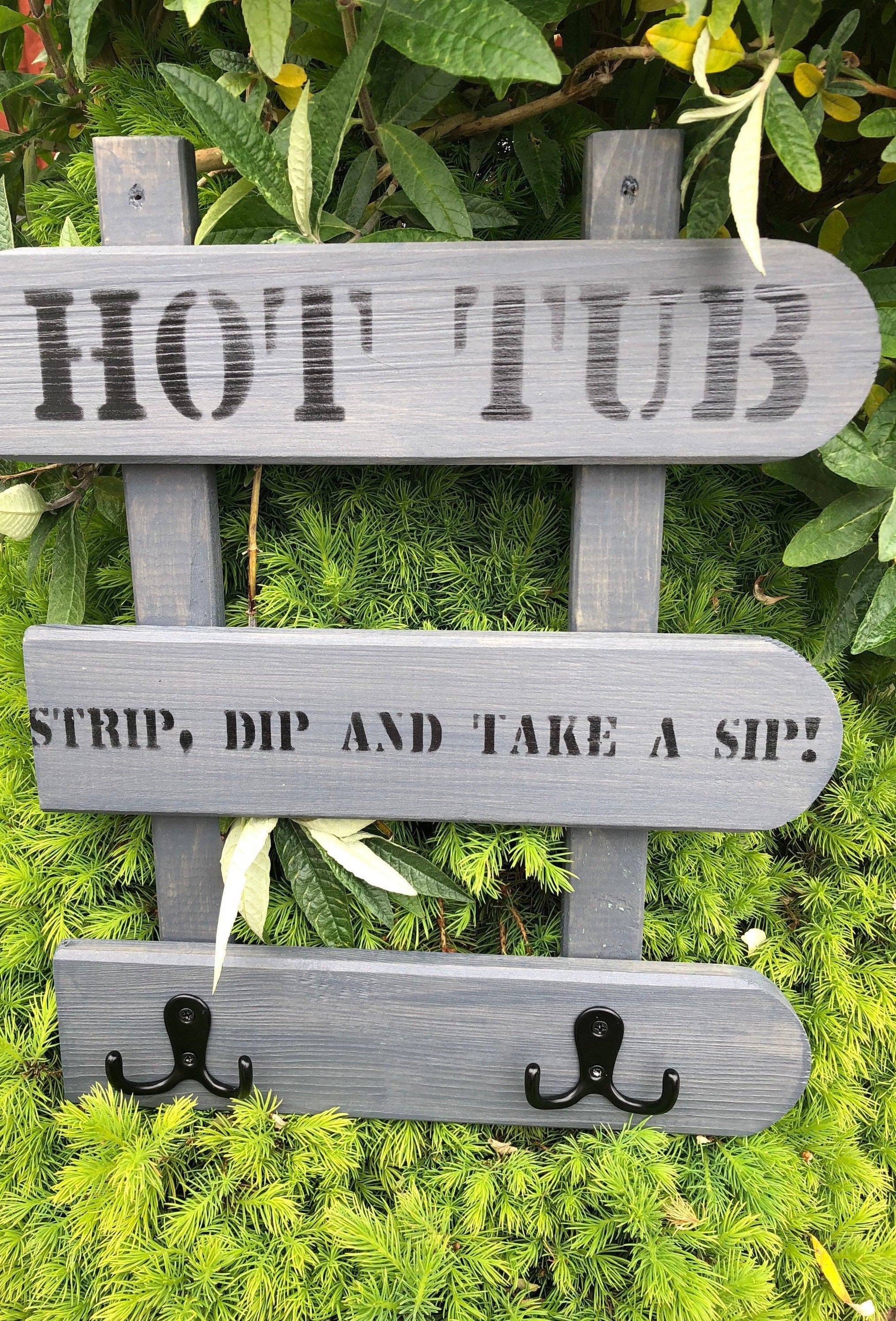 New grey rustic wooden hot tub sign in grey with hooks for towels o...
