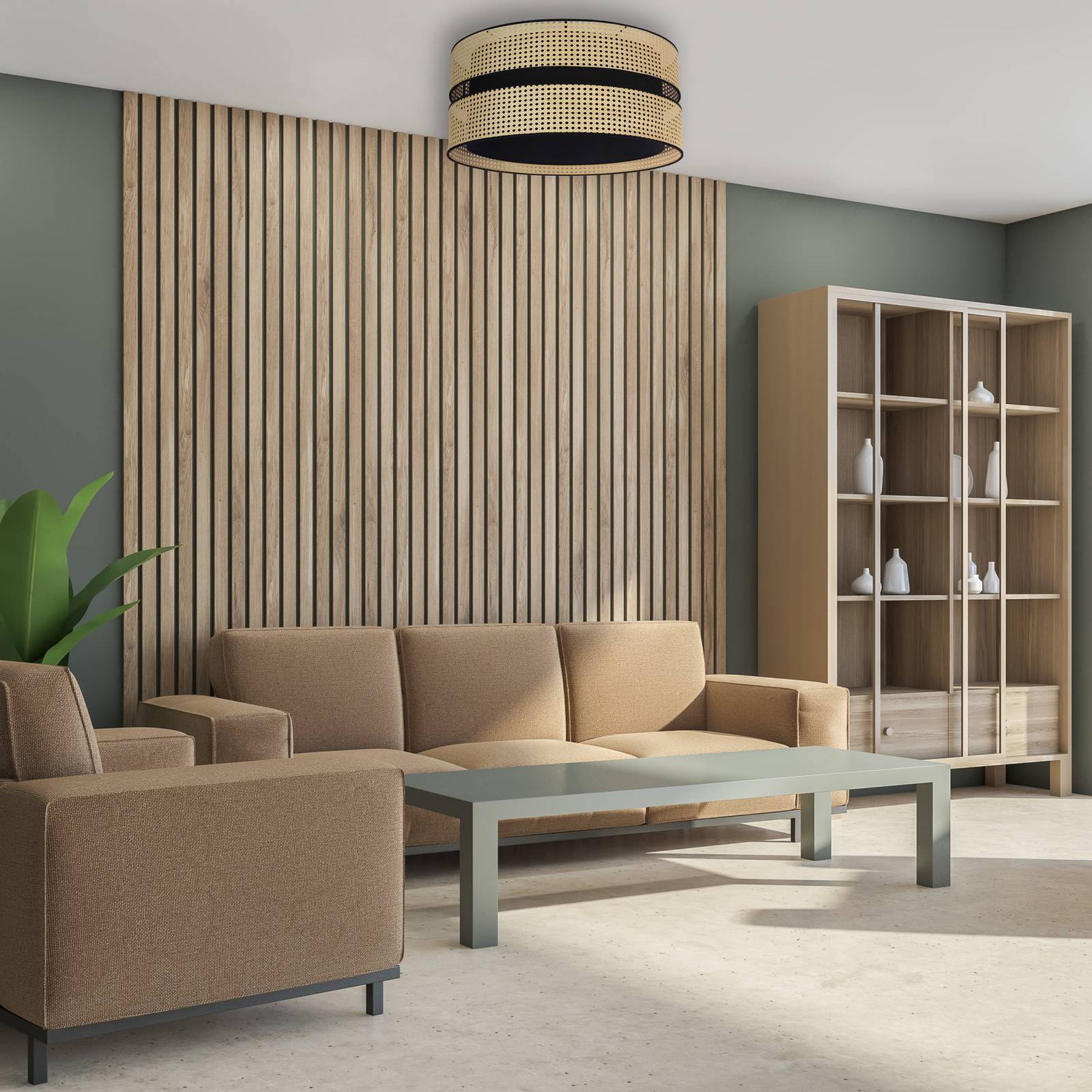 Round ceiling lamp Big Duo presents itself in a beige-black color scheme. It is made of rattan and c...