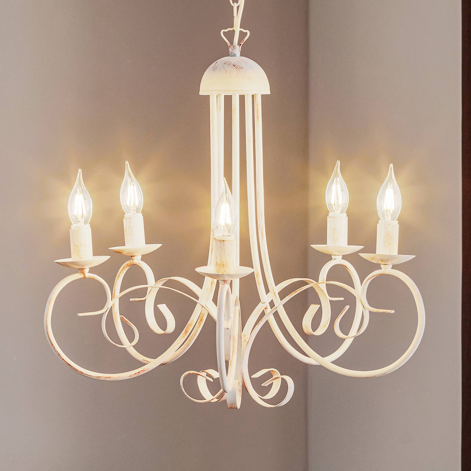 The Ayleen chandelier has six arms in the shape of candle holders. It is made of steel with a white ...