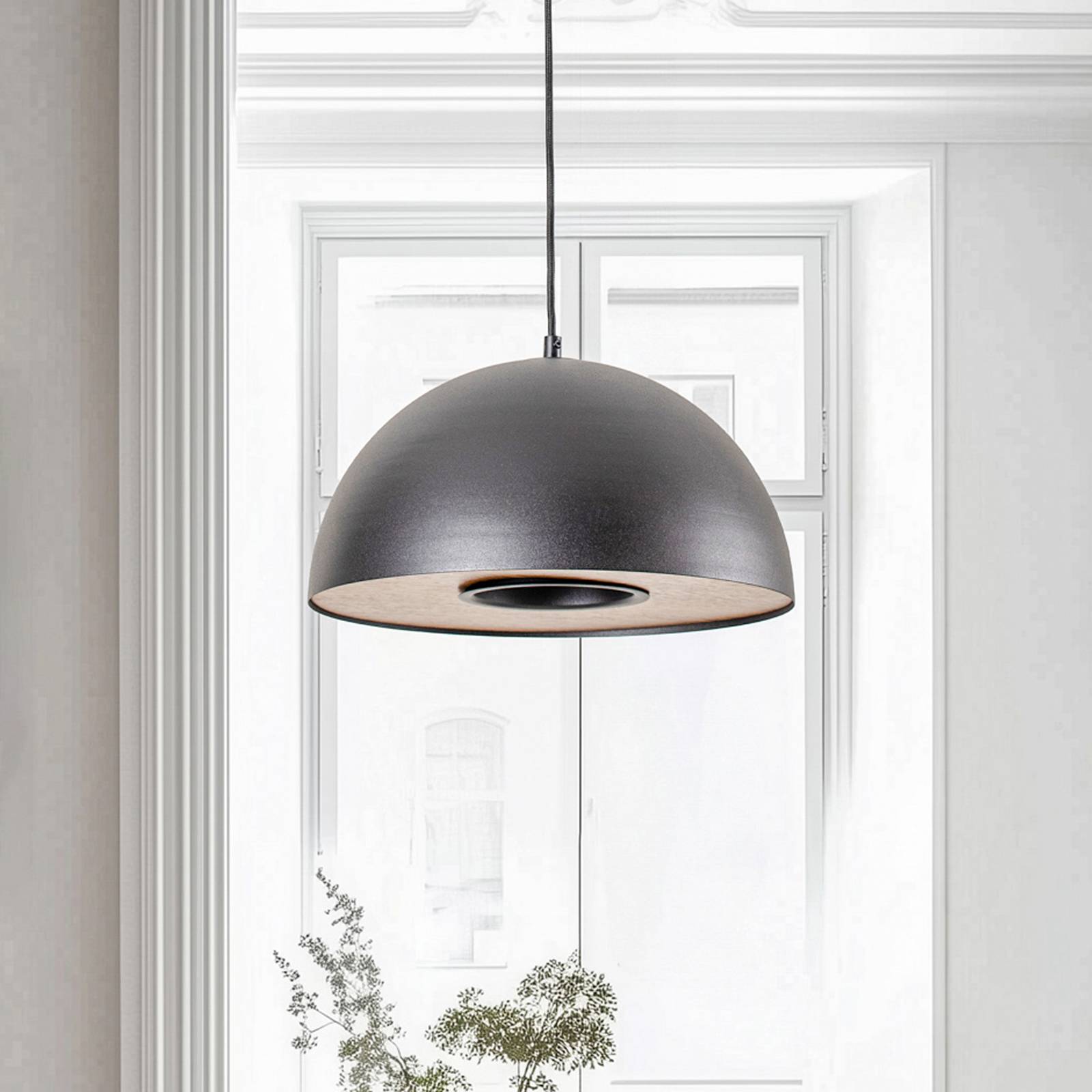 The black metal shade of the Drew pendant light in the shape of a hemisphere is closed at the bottom...