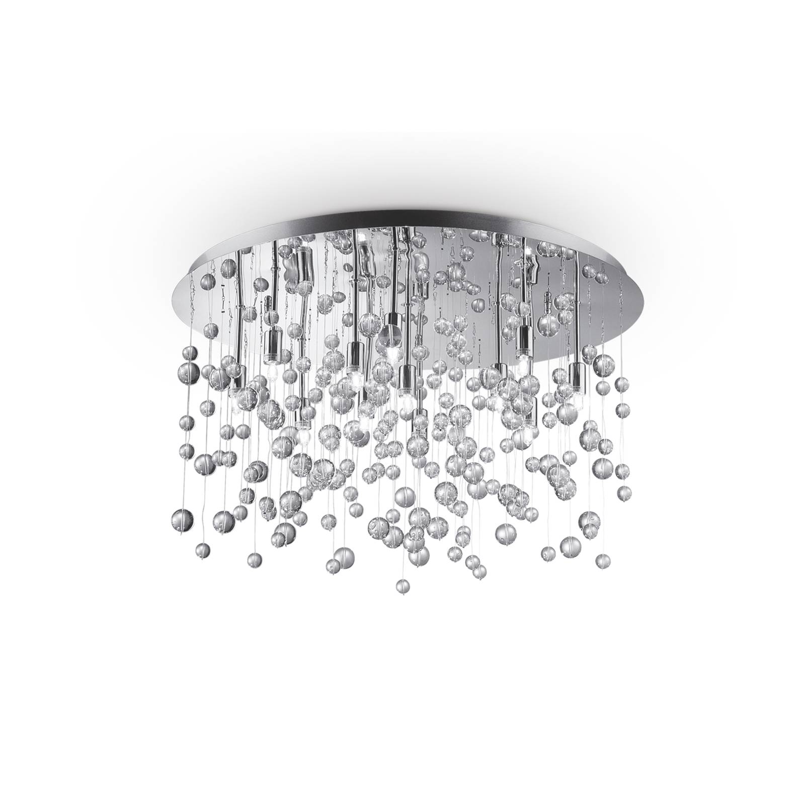 The 12-bulb Neve ceiling lamp stands for esprit and lightness. The chrome canopy and the numerous gl...