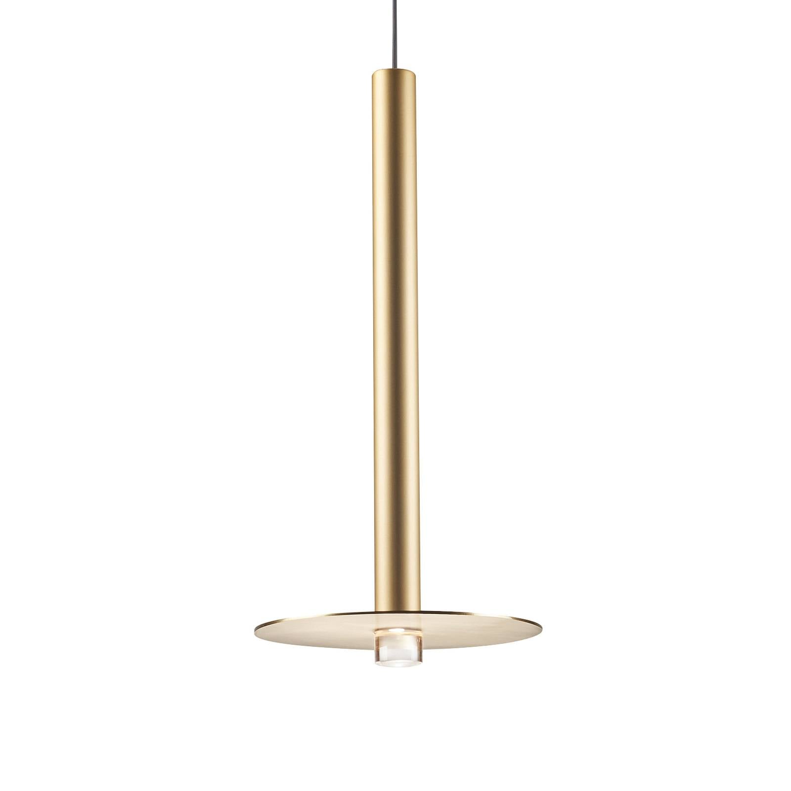 The Candle LED pendant light with its narrow tubular metal shade with a satin gold-coloured finish i...