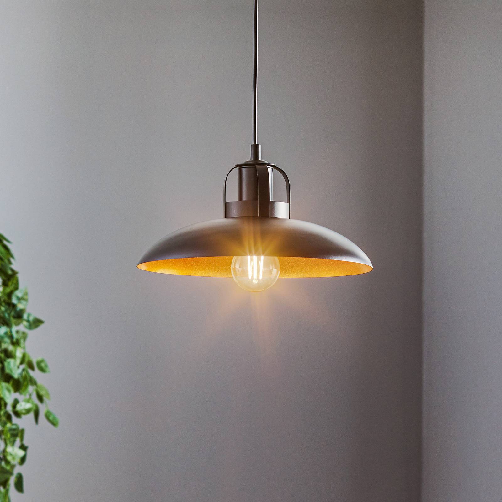 The 1-bulb Felix pendant light has a flat, black metal lampshade with a warm, antique gold finish on...