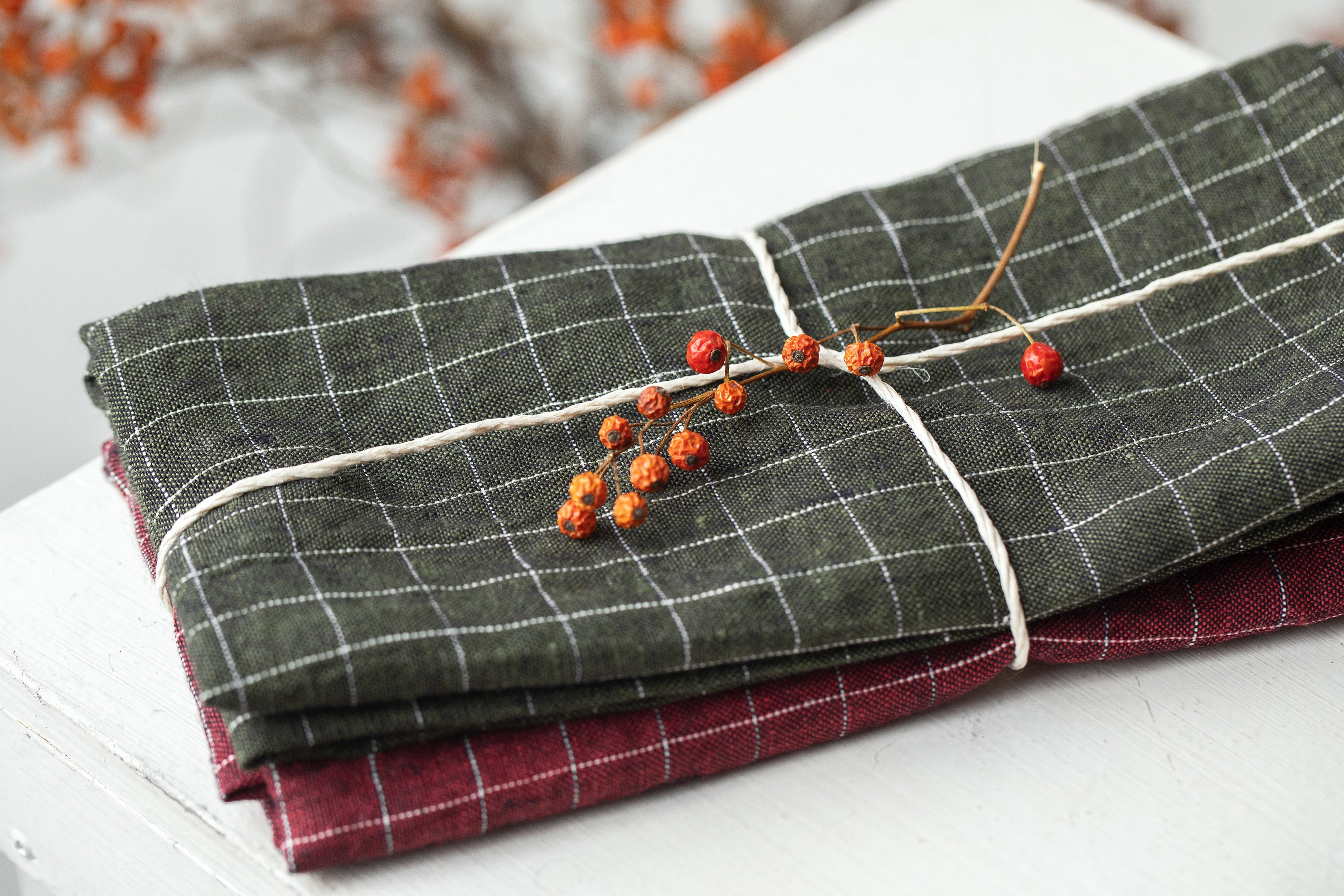Gingham linen towel, plaid linen tea towel, linen kitchen towel, bu...