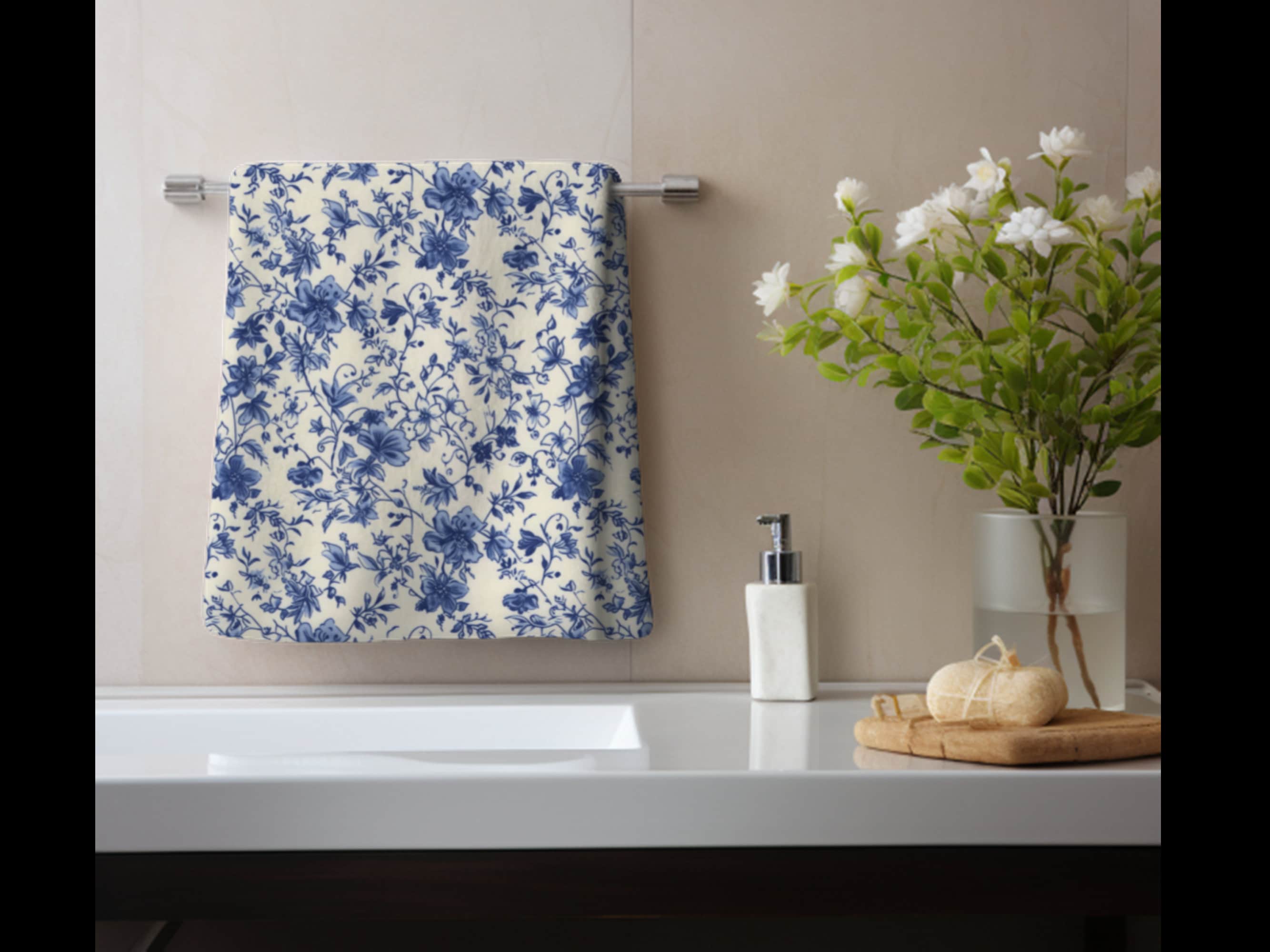 "Transform your bathroom into a serene space with this elegant blue floral towel featuring a de...