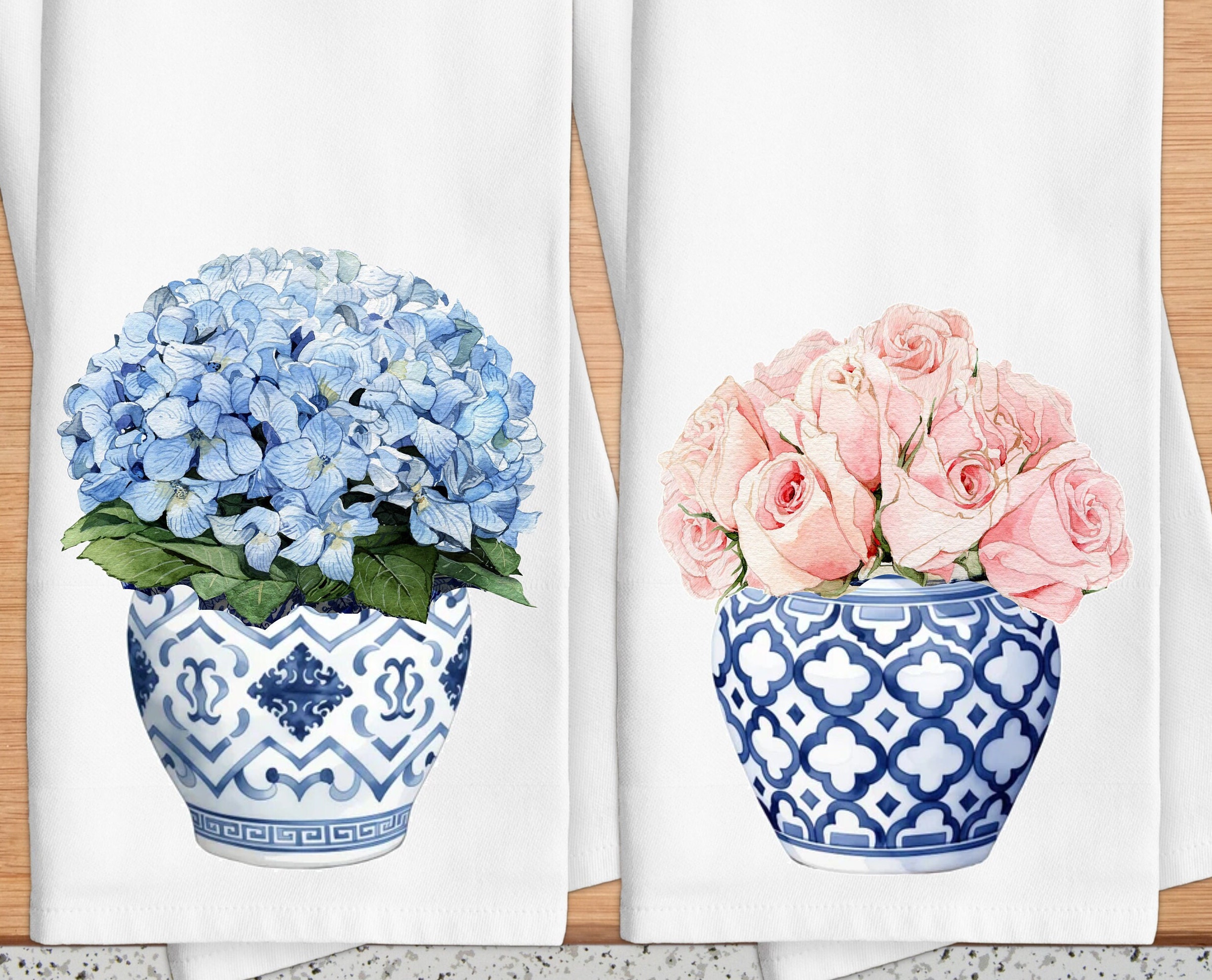 Blue Ginger Jar Rose Kitchen Towel, Blue Chinoiserie Tea Towel, Blu...