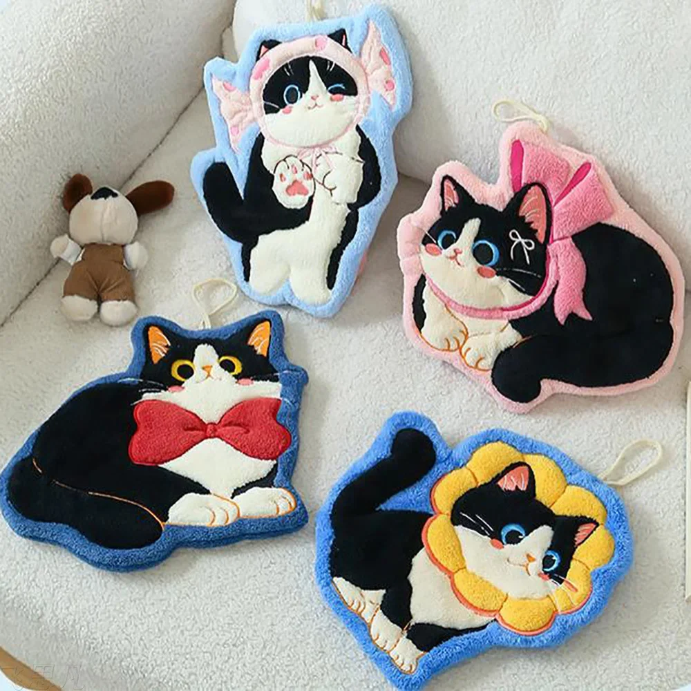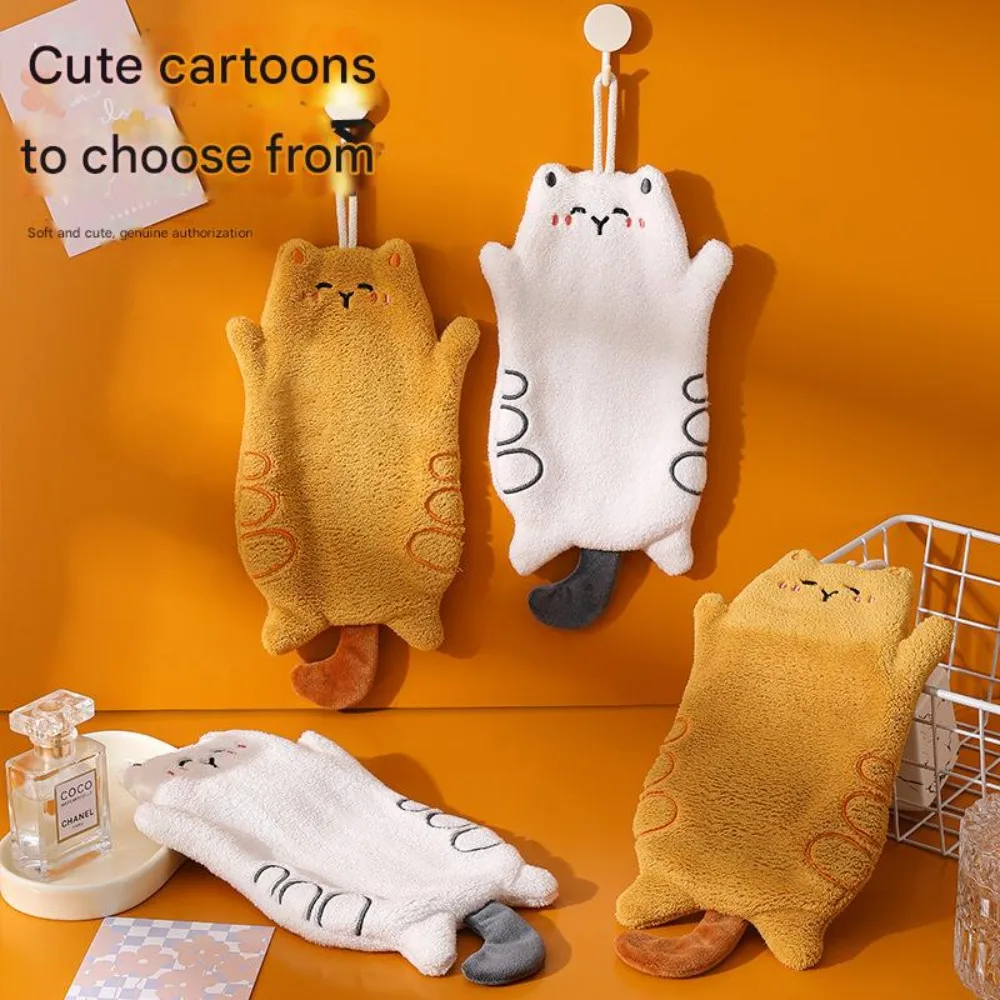 Cute Cat Hand Towel Hanging Coral Fleece Embroidered Cartoon Absorbent Towel for Kitchen Bathroom Ki...