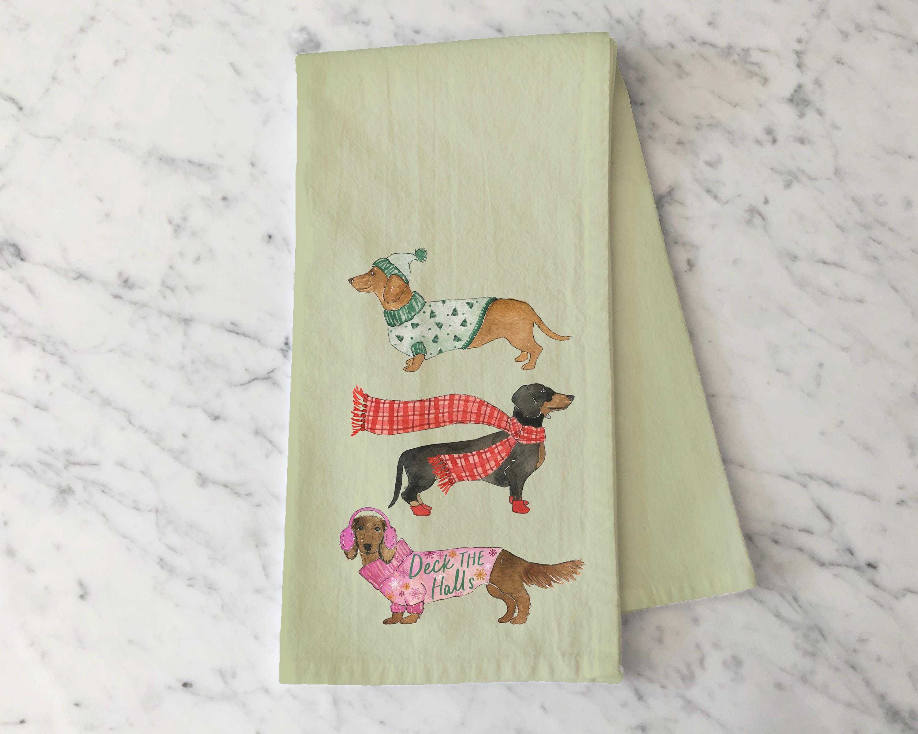 "Spread holiday cheer with this festive tea towel featuring watercolor Dachshund dogs dressed i...