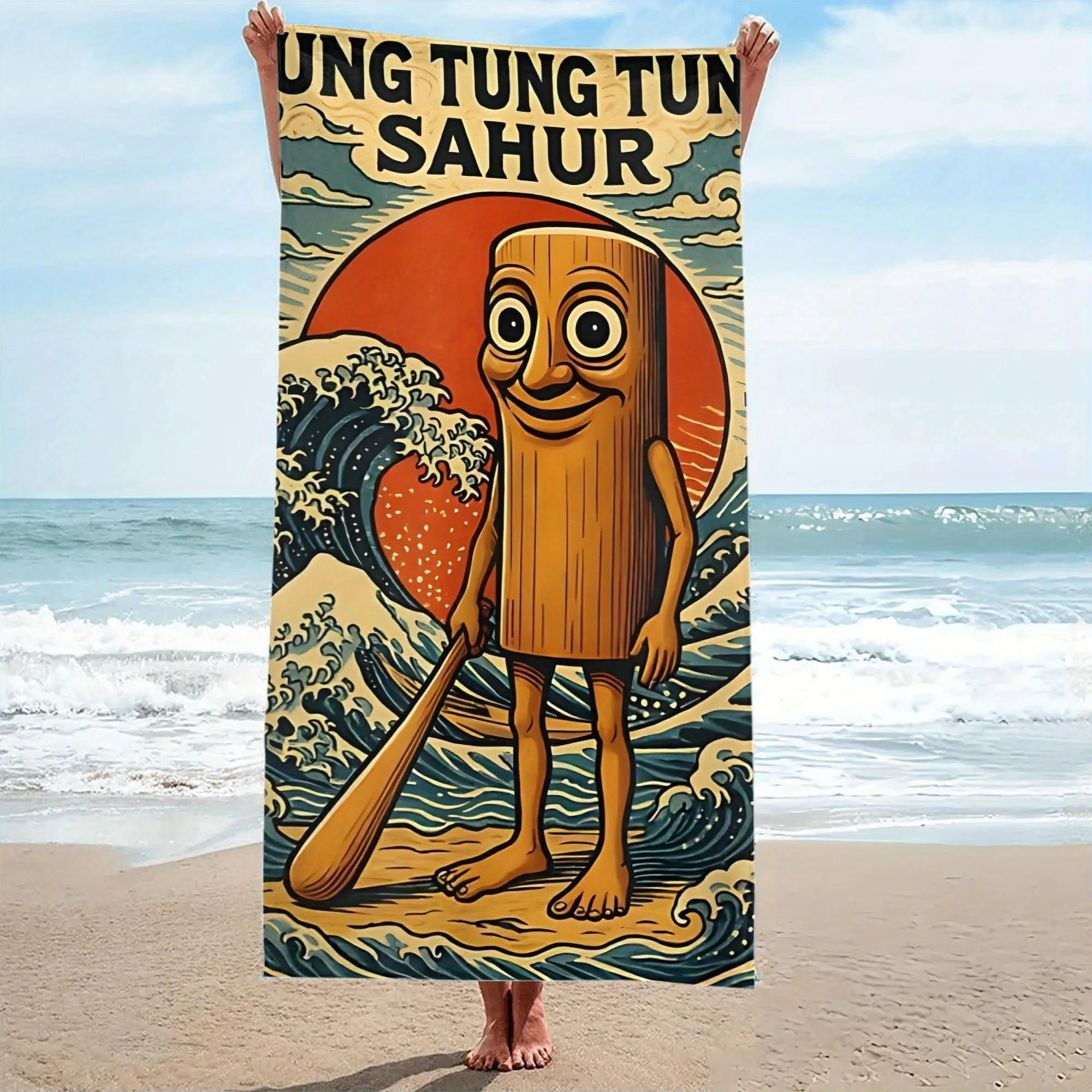 Tung Tung Sahur Italian Cerebral Palsy Meme Print Beach Towel Humorous Cartoon Design Vibrant Waves ...