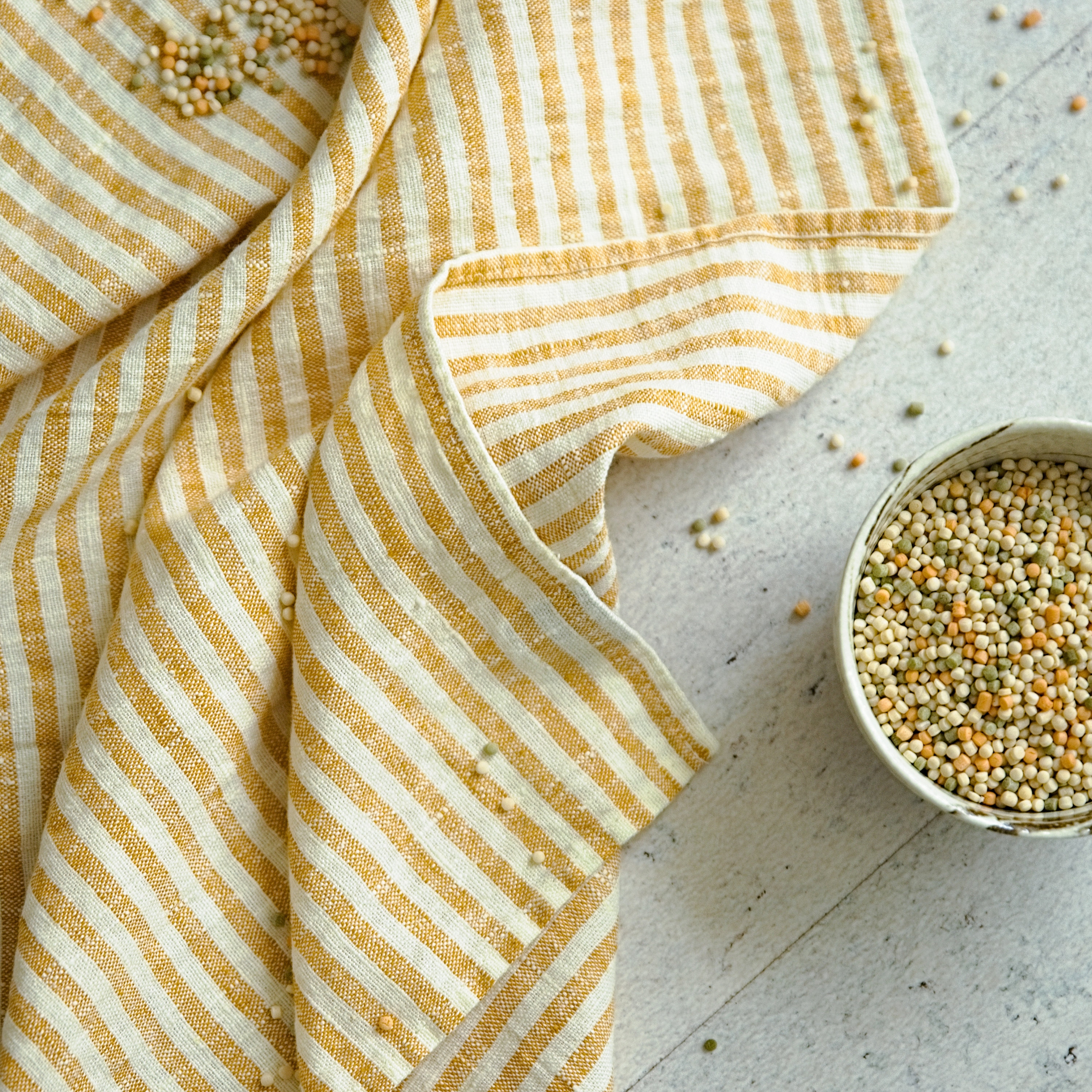 Set of 2 Linen Tea Towels in Striped Gold, Yellow / White. Washed l...
