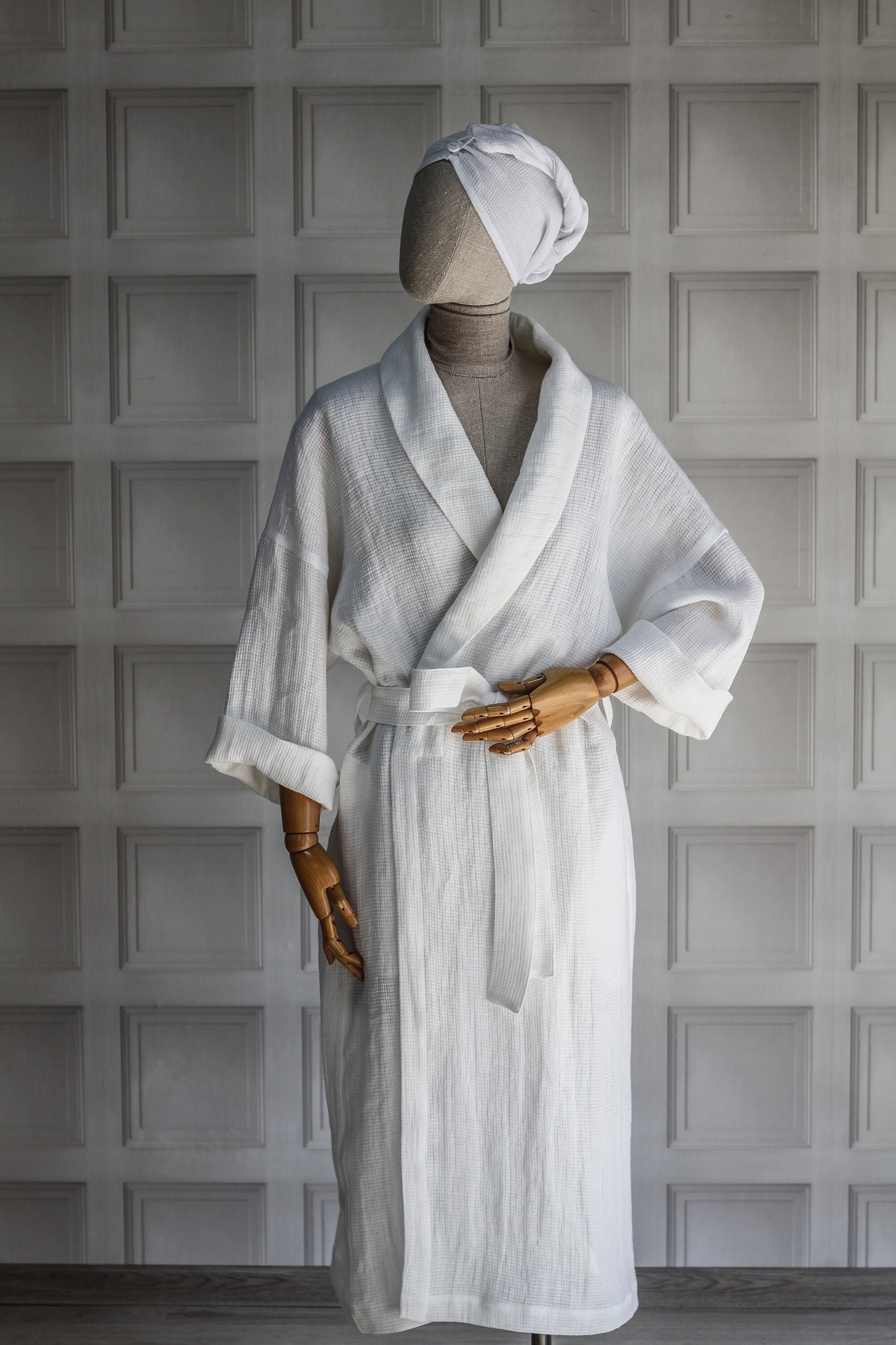 White linen hair turban towel is made of natural soft waffle weaving linen (100% linen). Wrap style ...