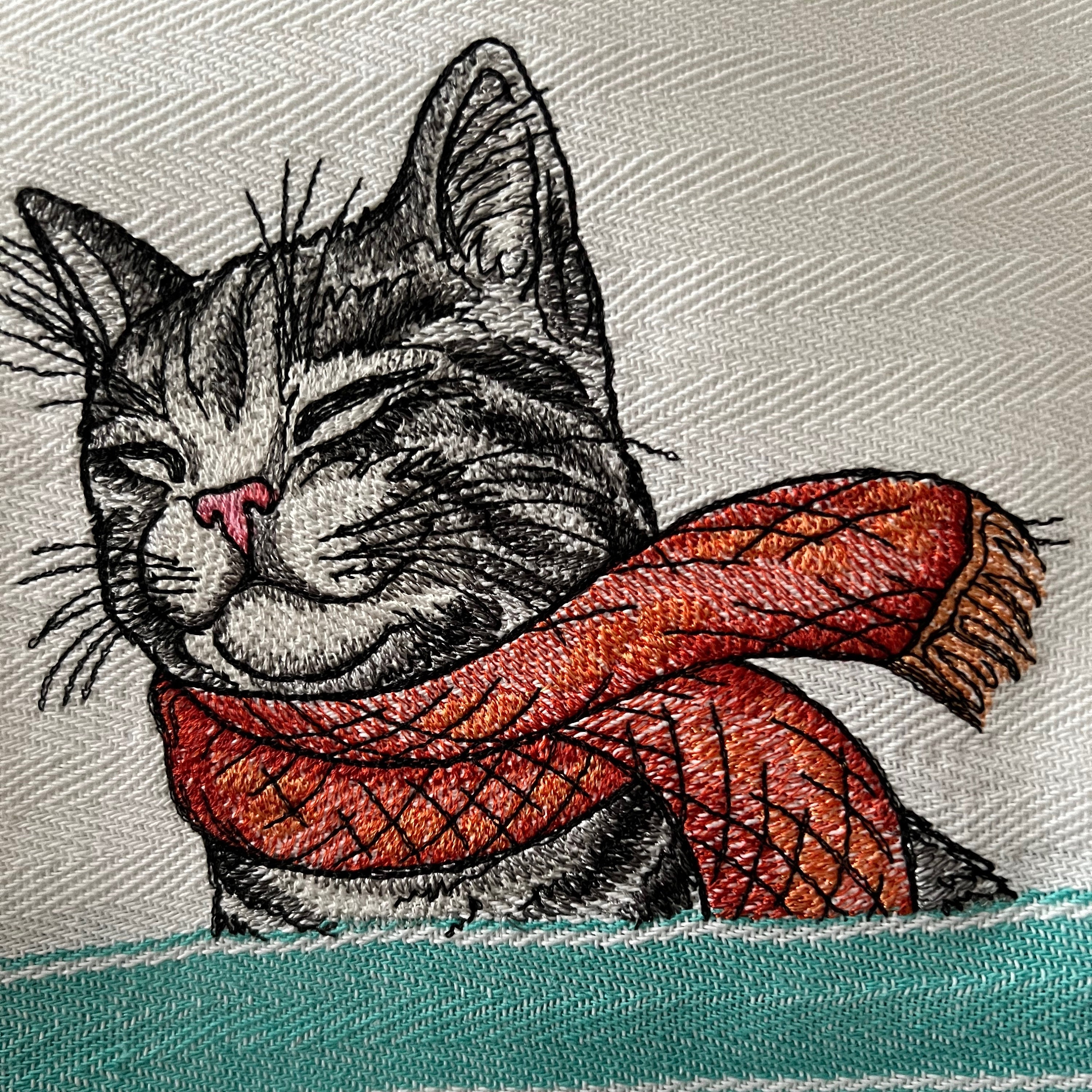 Embroidered Tea Towel: A Cat and a Scarf