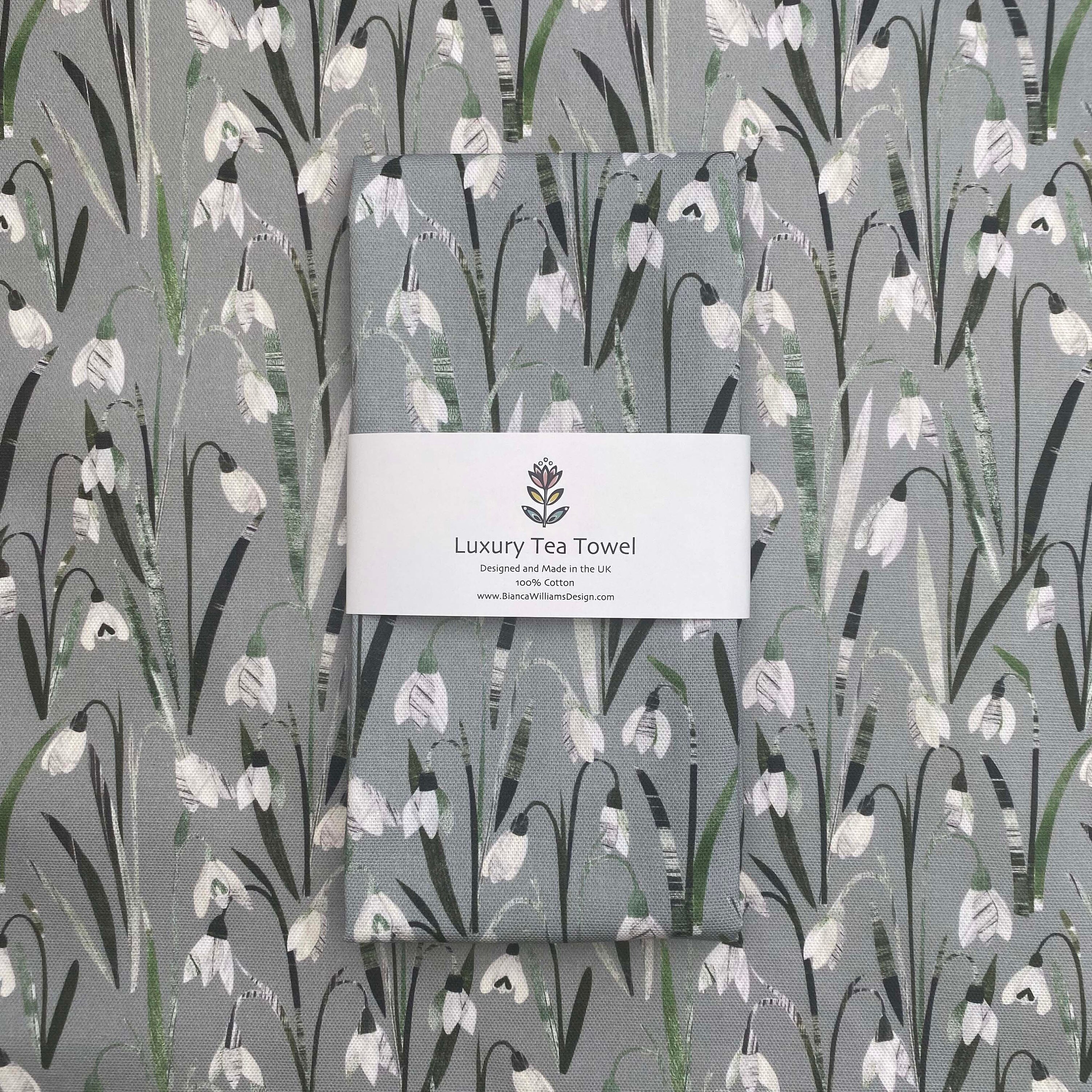"Snowdrop Tea Towel, this listing includes FREE POSTAGE. Unique hand drawn and collaged Floral ...