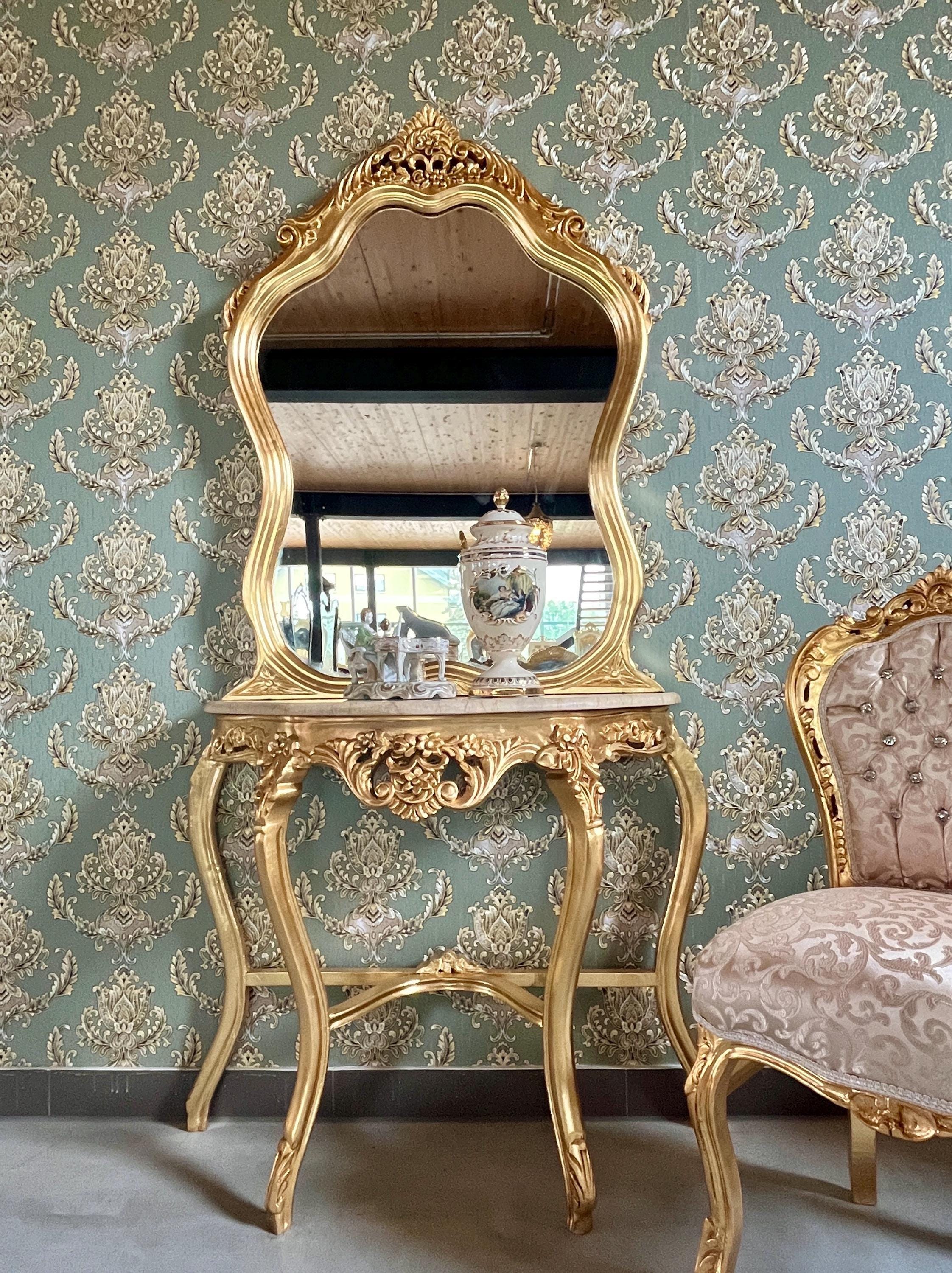 An antique baroque style mirror with table console in reproduction; including a oval-like shaped mir...