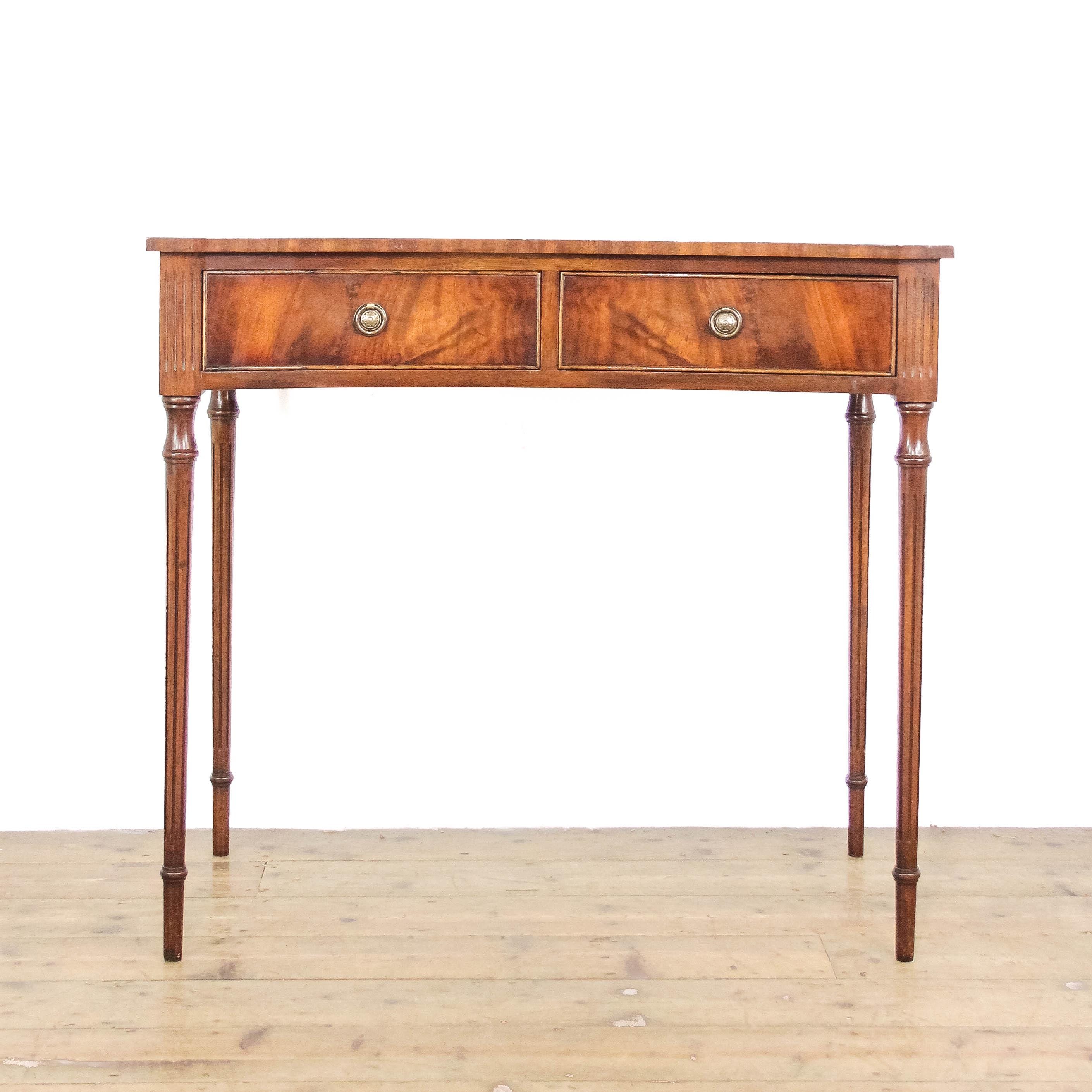 An elegant mahogany side table with a curved front and two drawers. The table stands on slender, ree...
