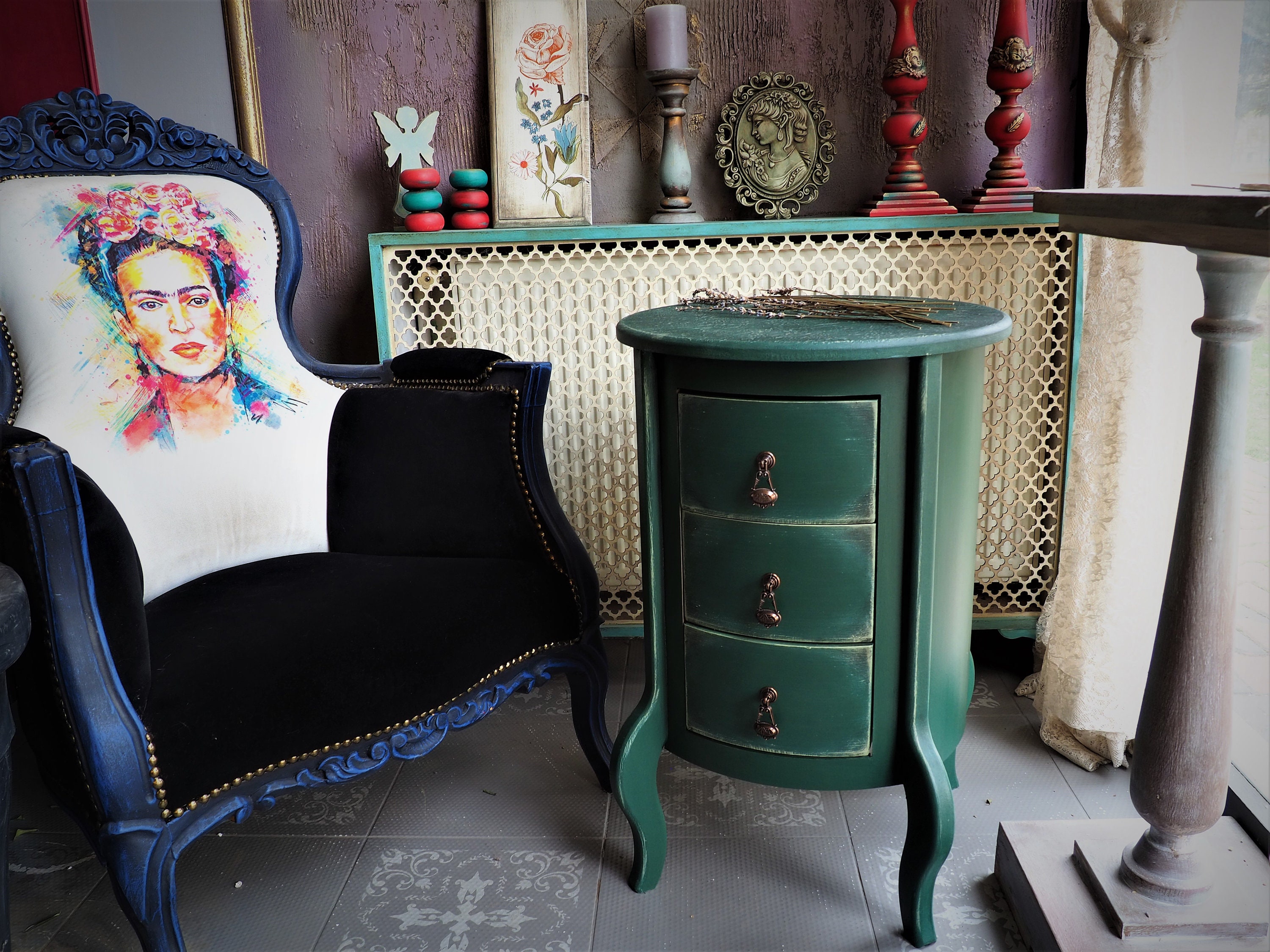 Purple round bedside table. Wooden side table with drawer. Hot pink...