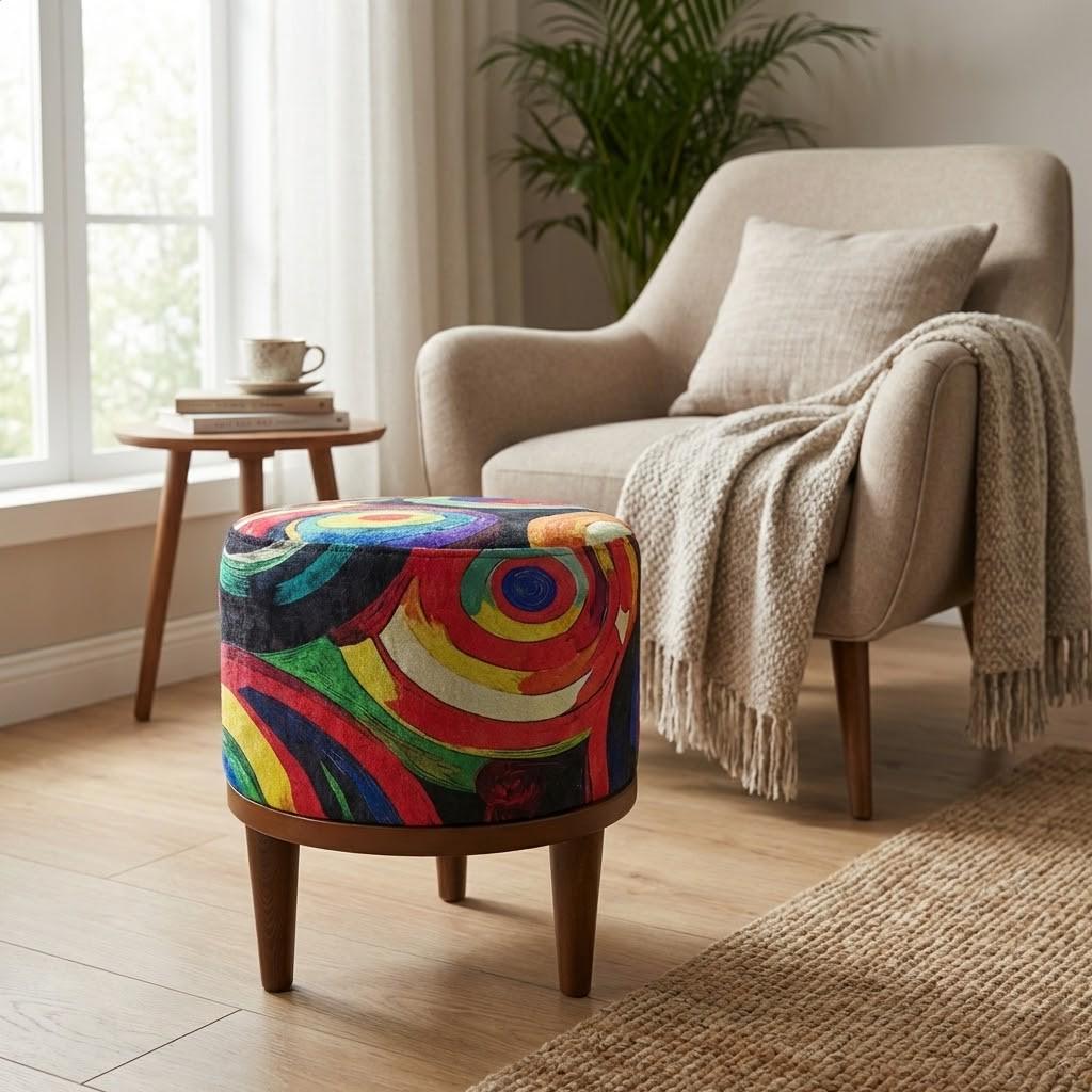 Multicolor footstool, Solid wood pouf, Ottoman round bench, Round c...