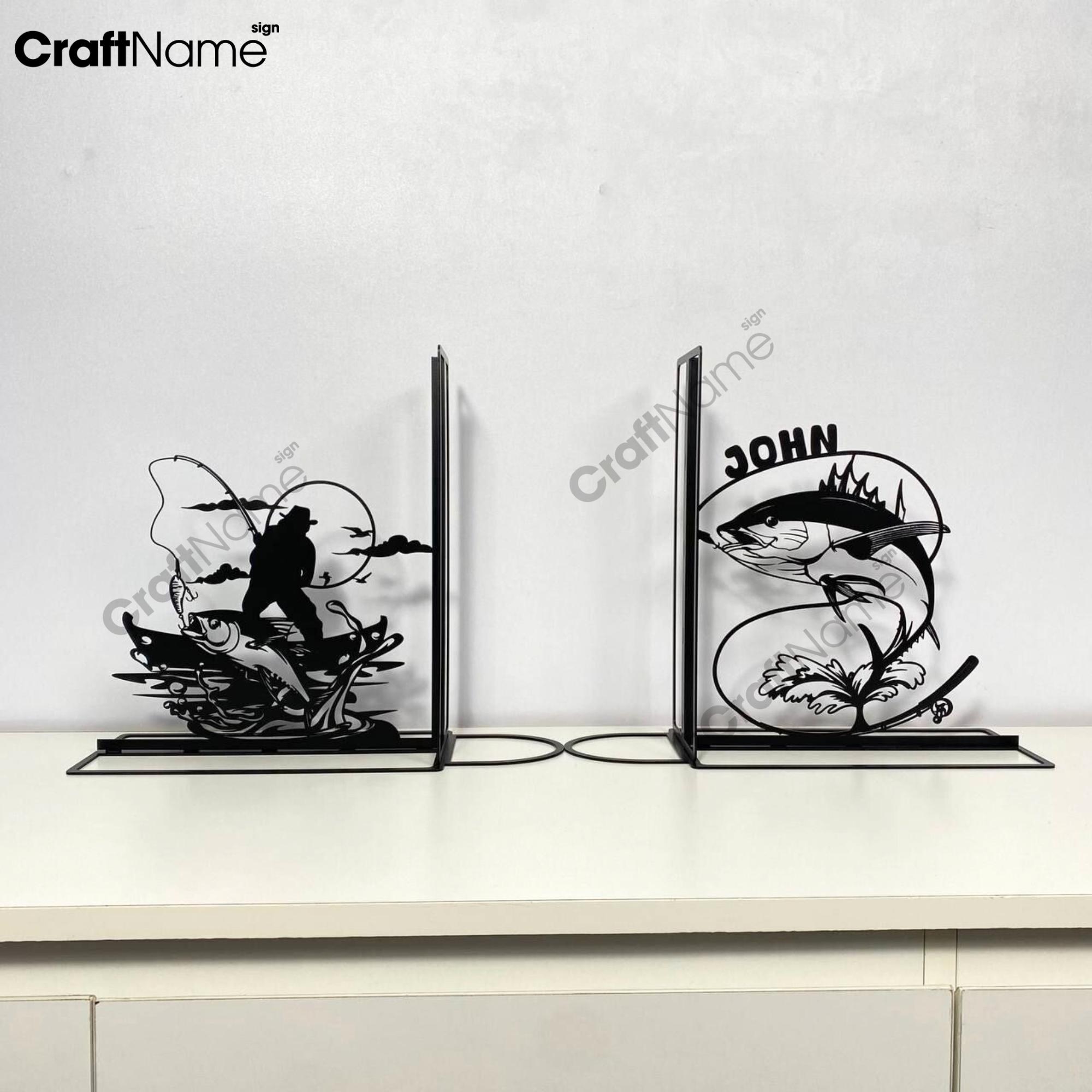Personalized Fisherman Metal Bookend, Custom Bass Fishing Book End,...