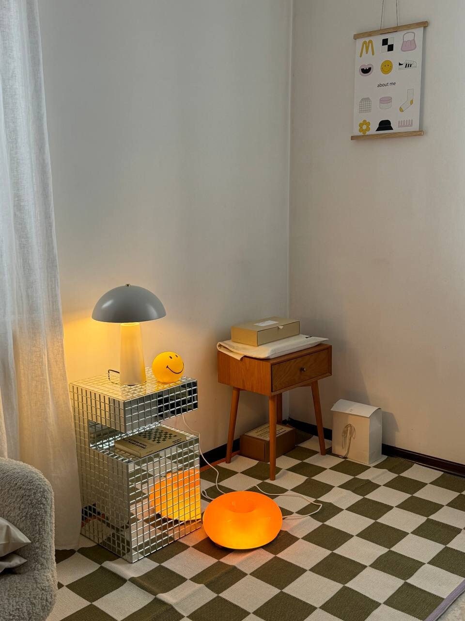 Tiled yellow and white cube. Designed tiled furniture. Side table. ...