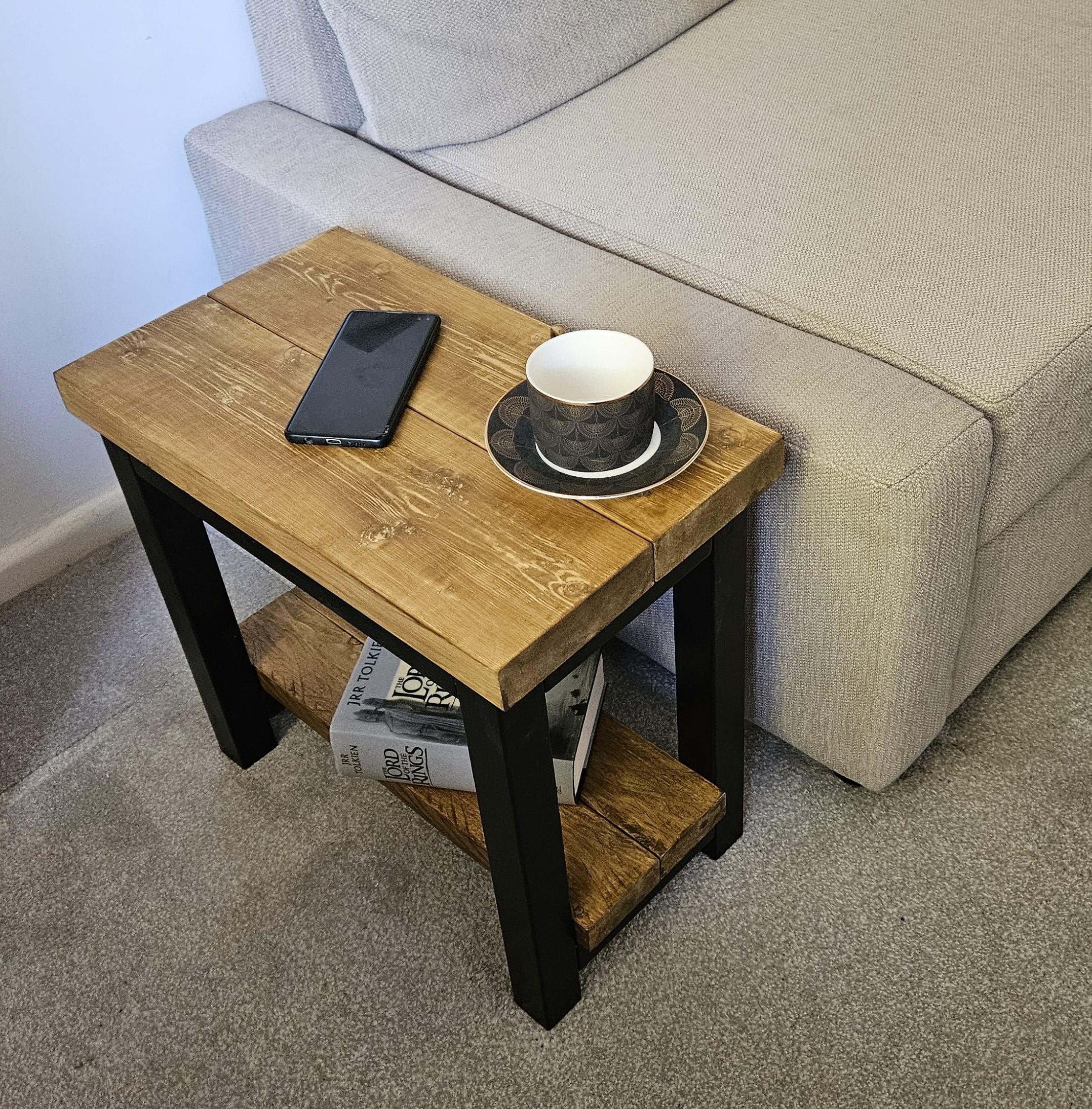 Handmade rustic sofa slim end table looks beautiful in any lounge. Is great for storing books, magaz...