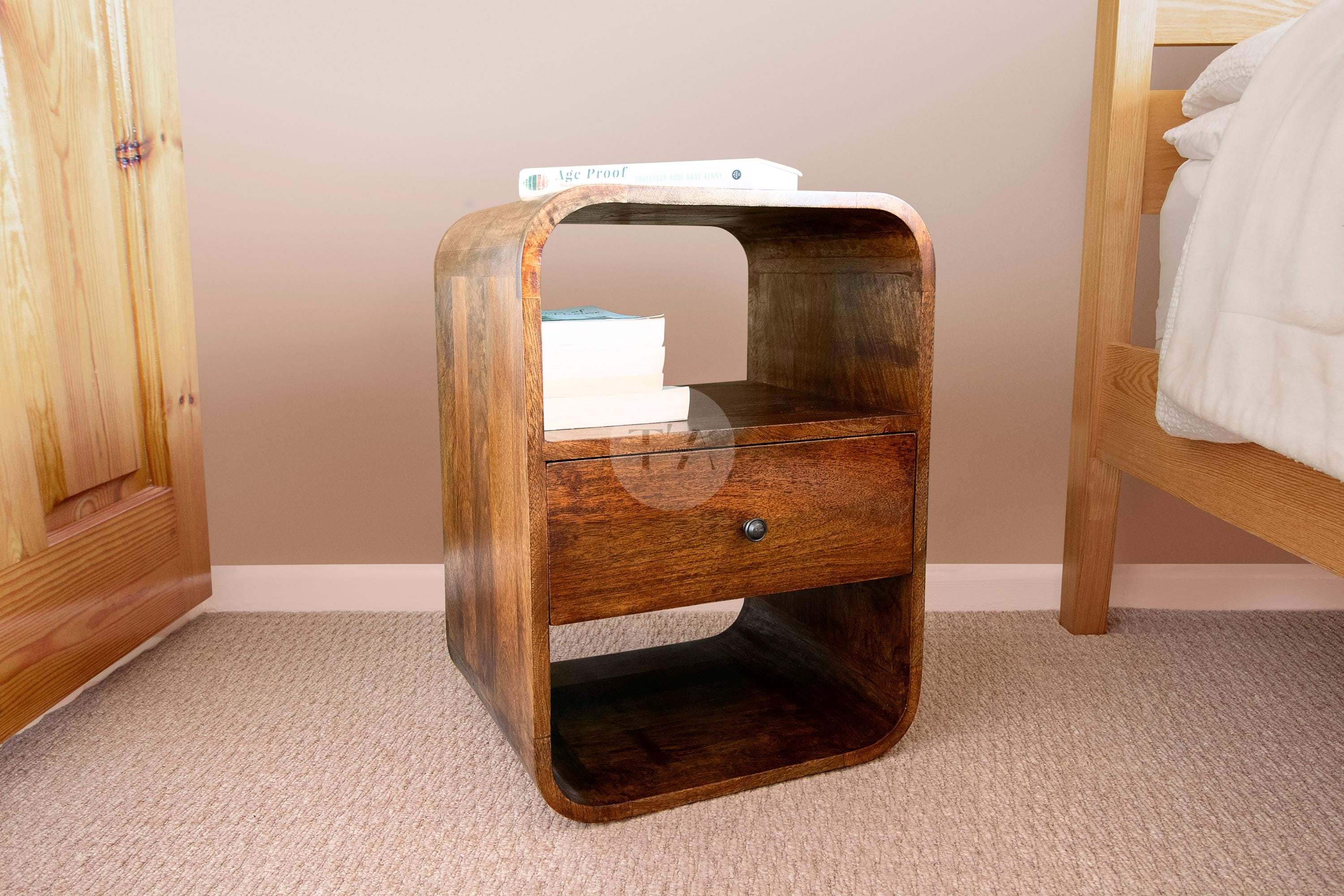 Our rustic wooden farmhouse bed side table in dark finished mango wood has a touch of modern Danish ...