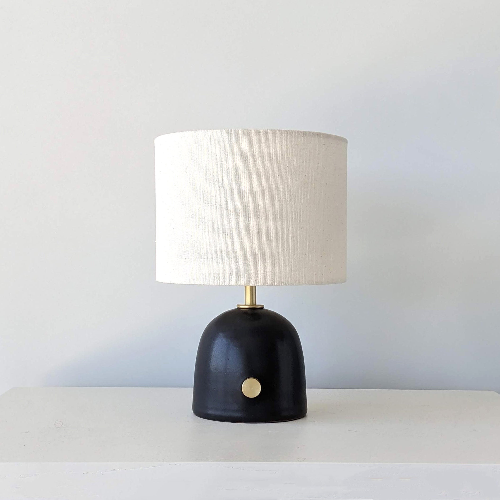 A small black handmade table lamp that will be a beautiful addition to any room. Its frosty glass sh...