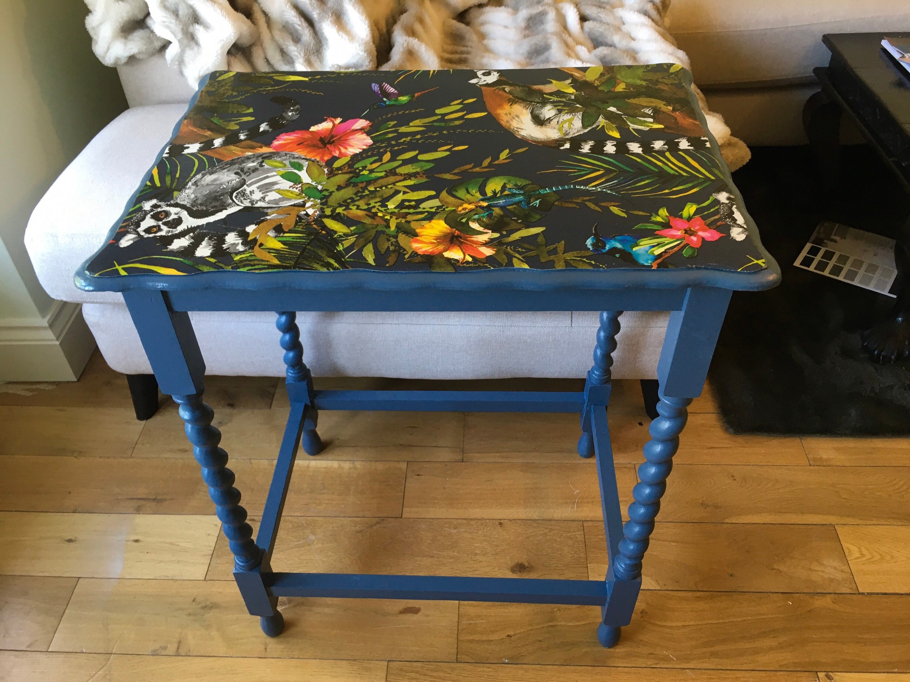 Barley twist vintage table decouperaged in Lemur tropical print