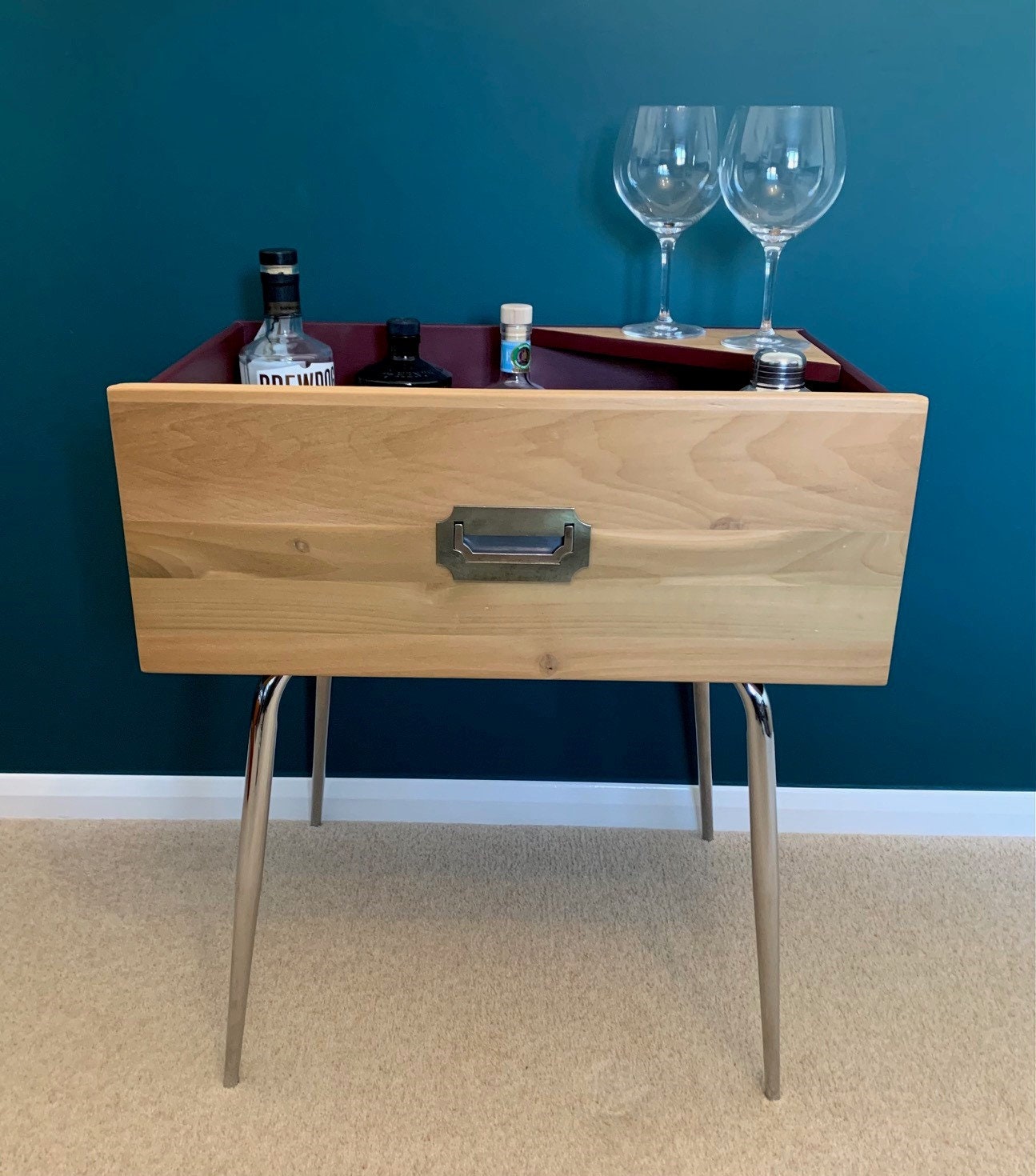 Upcycled Drawer Table with Chrome Legs - Red Wine Chilli Finish