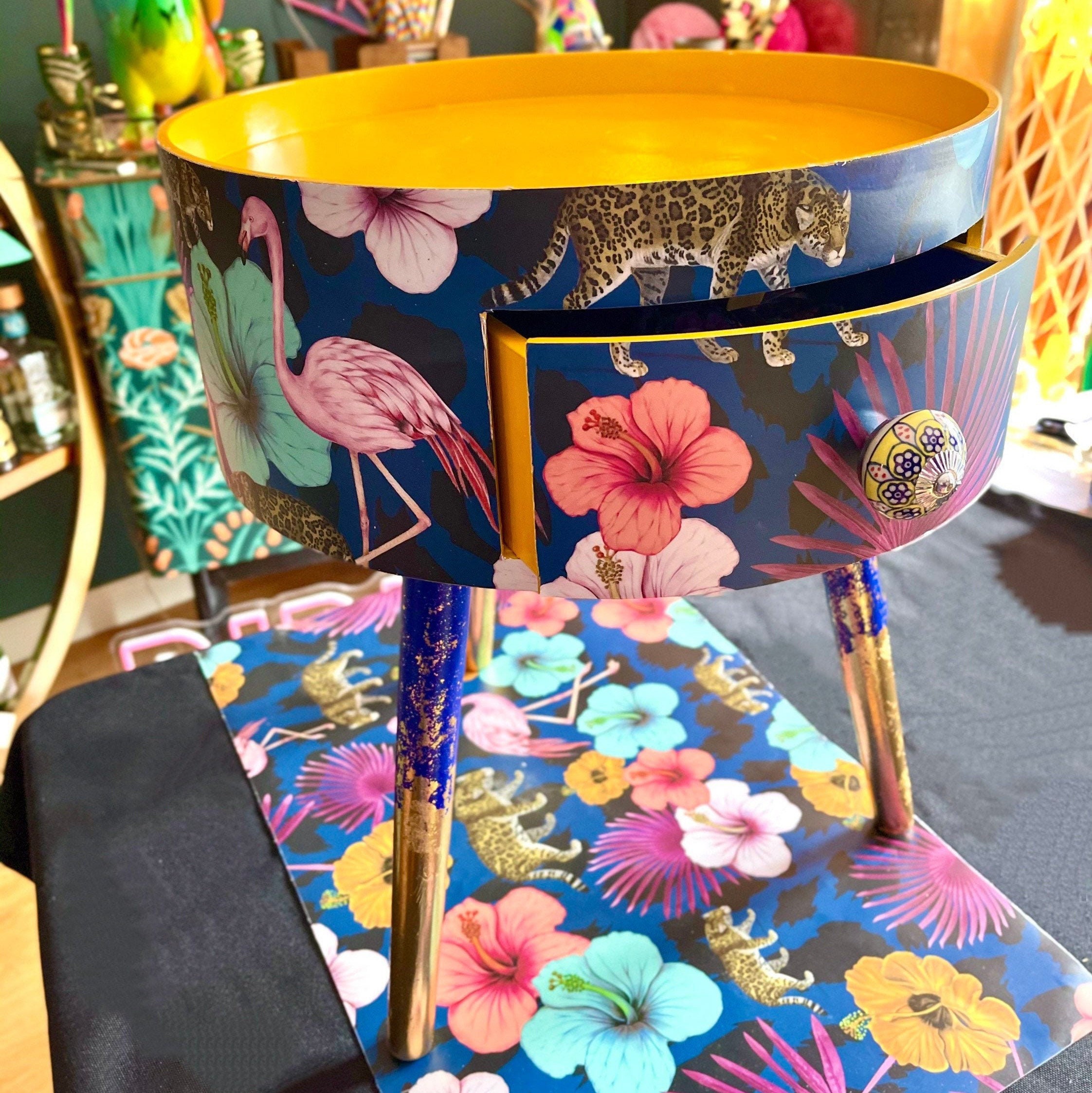 Beautiful tropical side table for sale Yellow top with bright blue legs with a stunning tropical vin...