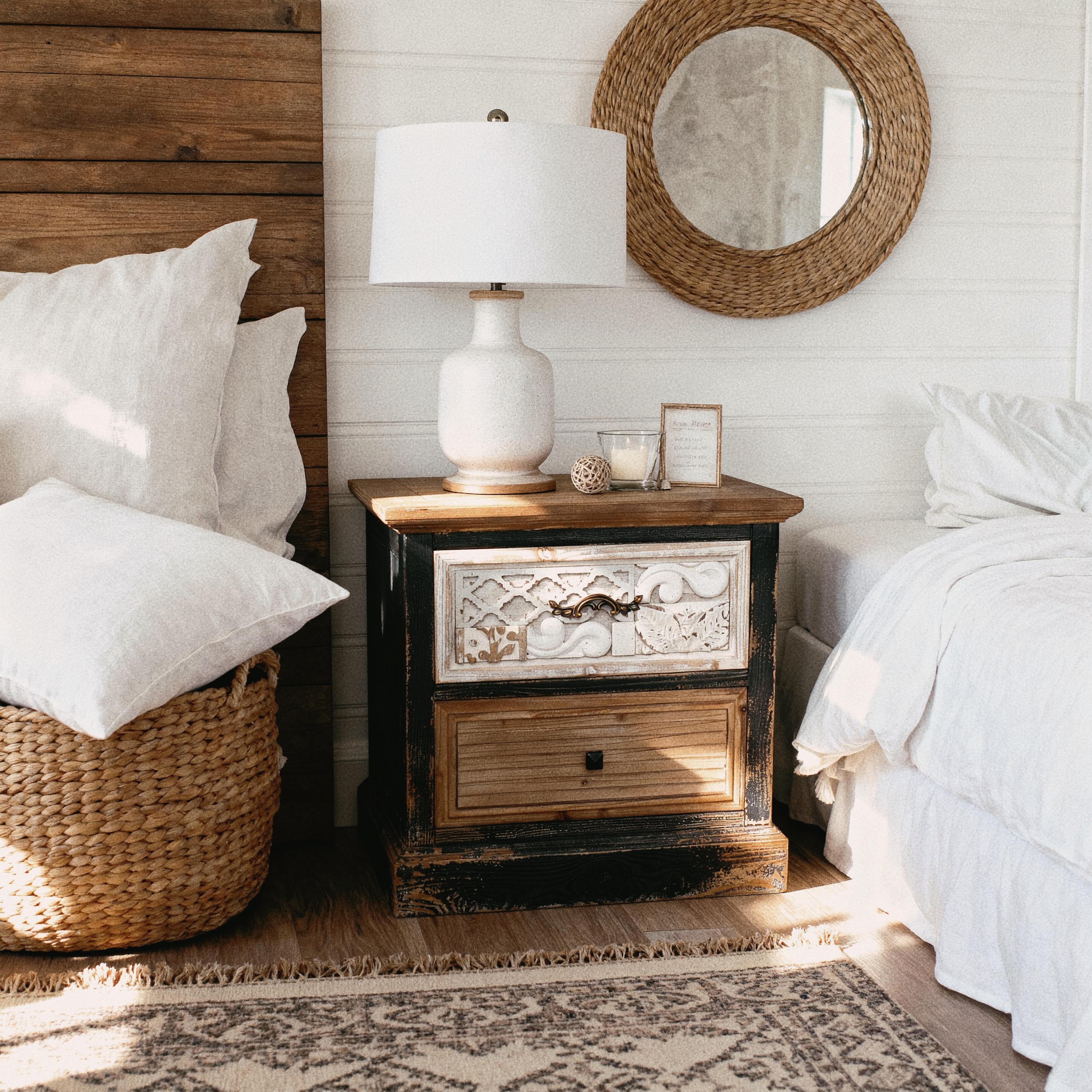 Bring warmth and vintage charm to your bedroom with this French country-style nightstand, crafted wi...