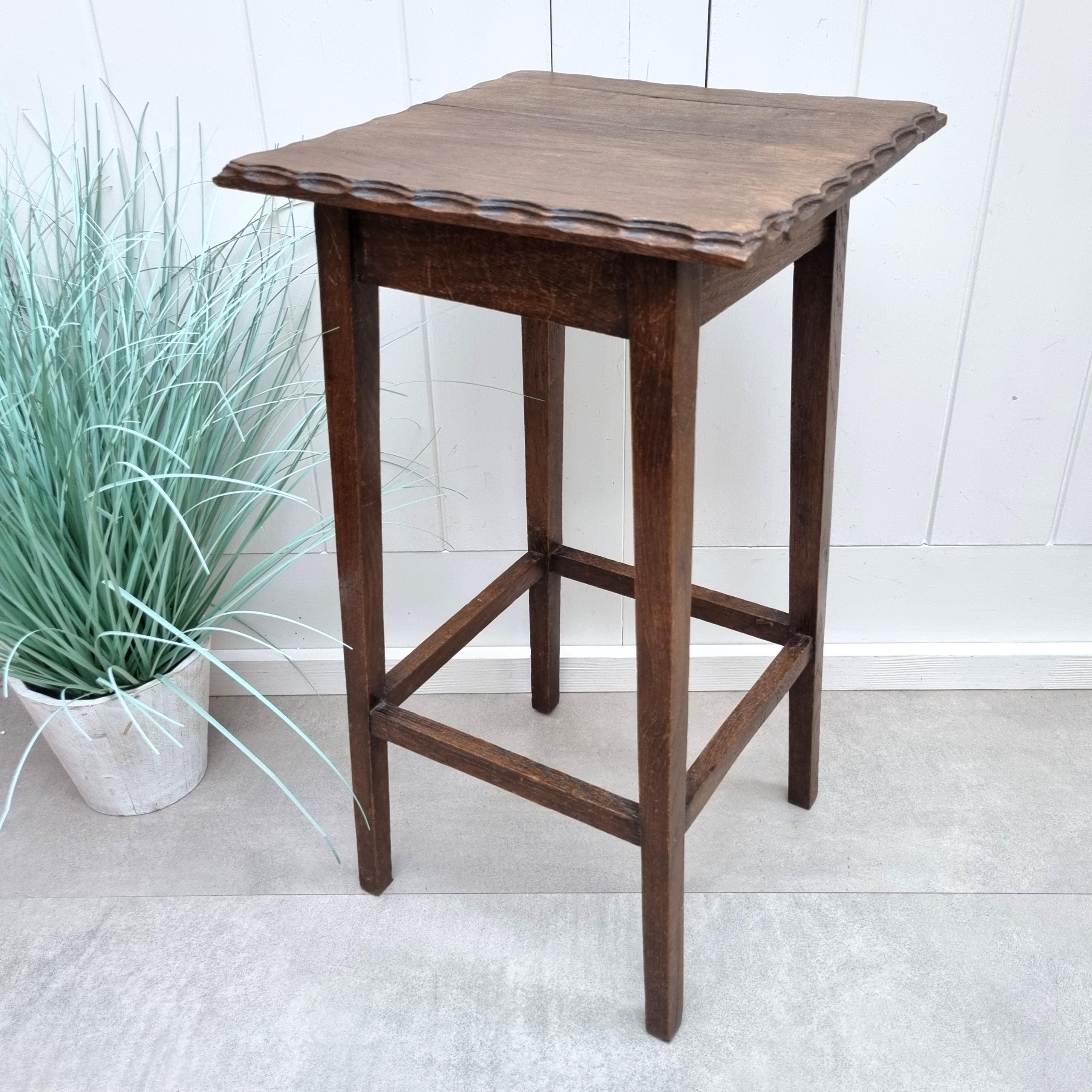 Vintage Wooden Plant Stand, Rustic Oak Side Table, Display Table with Scalloped Edge, Small Accent F...