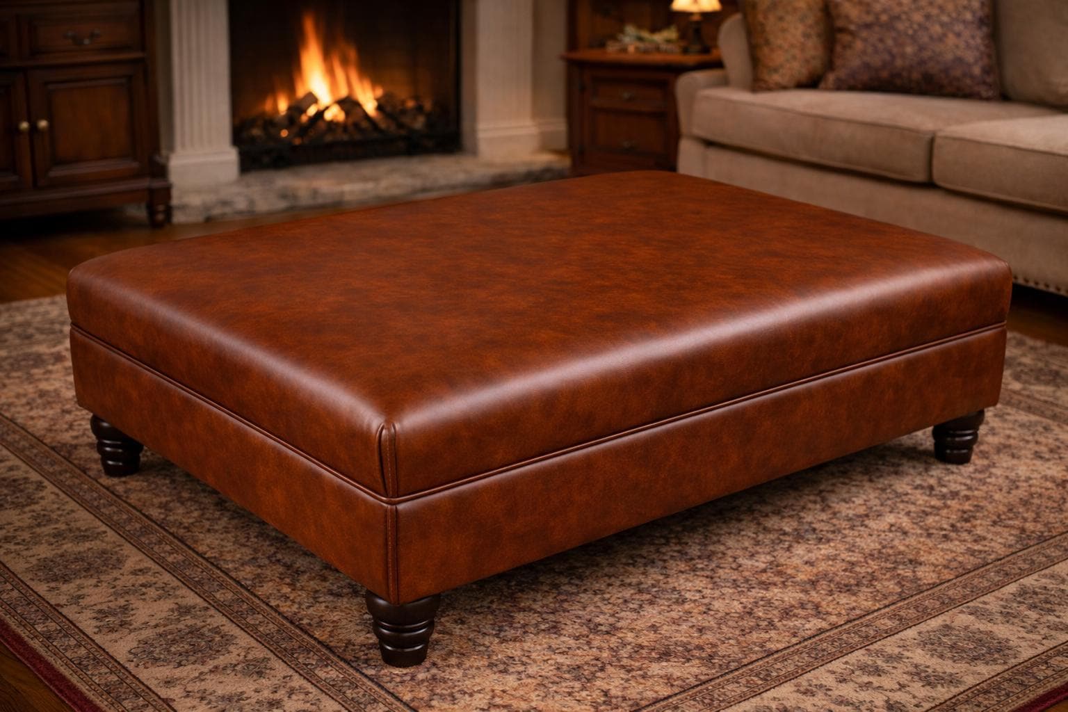 Extra Large Flat Top Footstool With Piping Detail Chestnut Faux Lea...