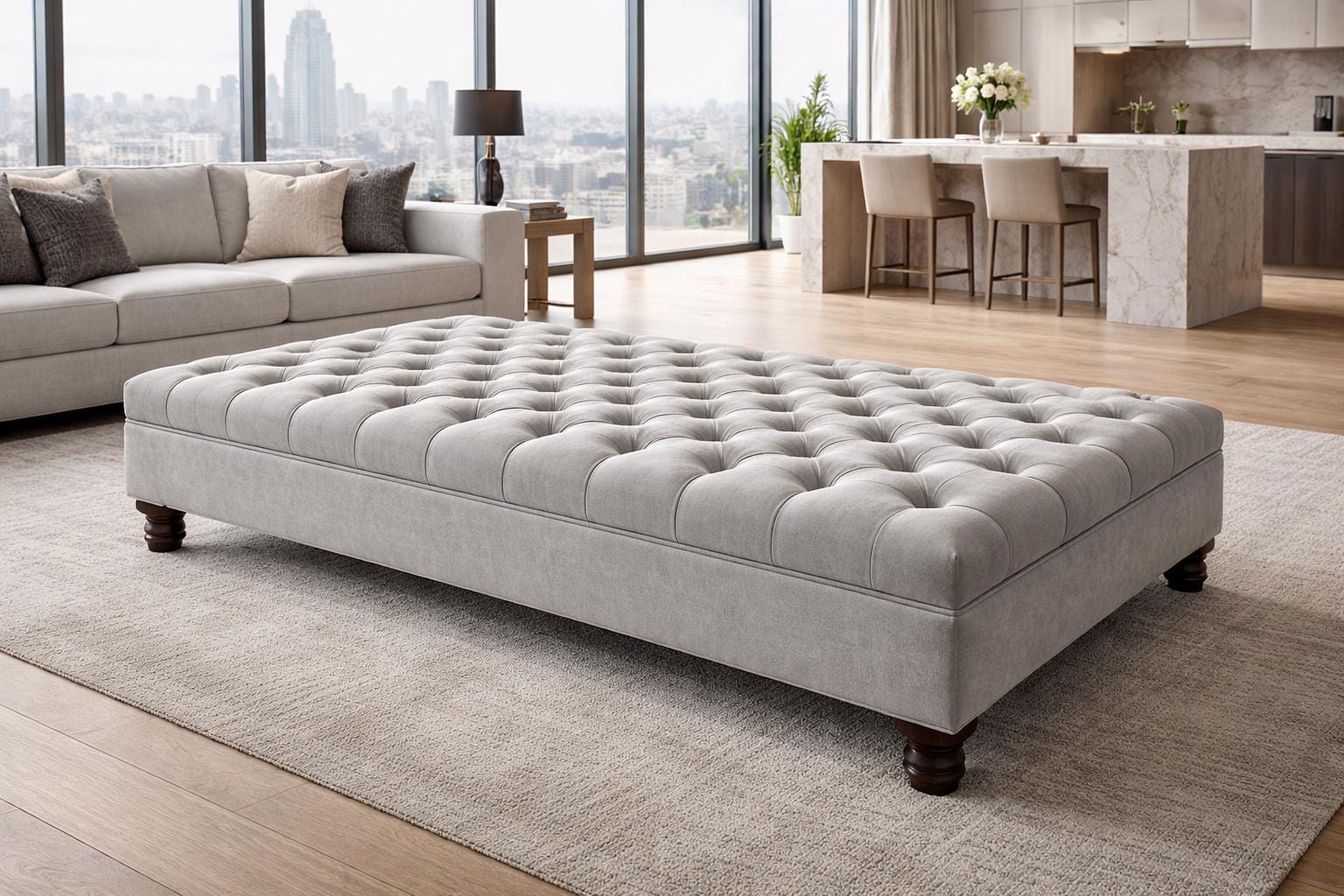 Chesterfield Footstool, Extra Large Silver Fabric, Turned Wood Legs