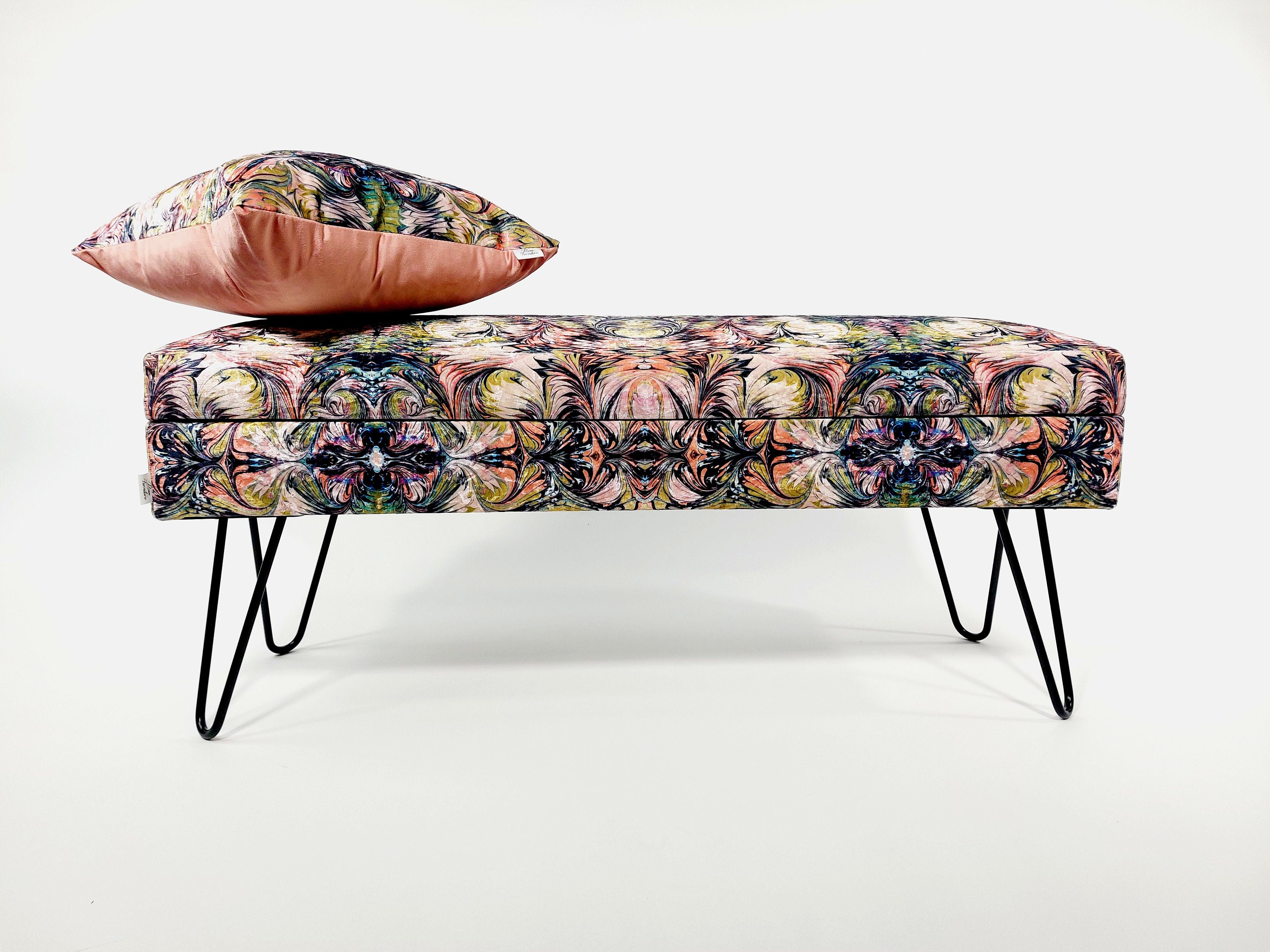 ELECTRA II bench in patterns fabric, storage compartment, steel leg...