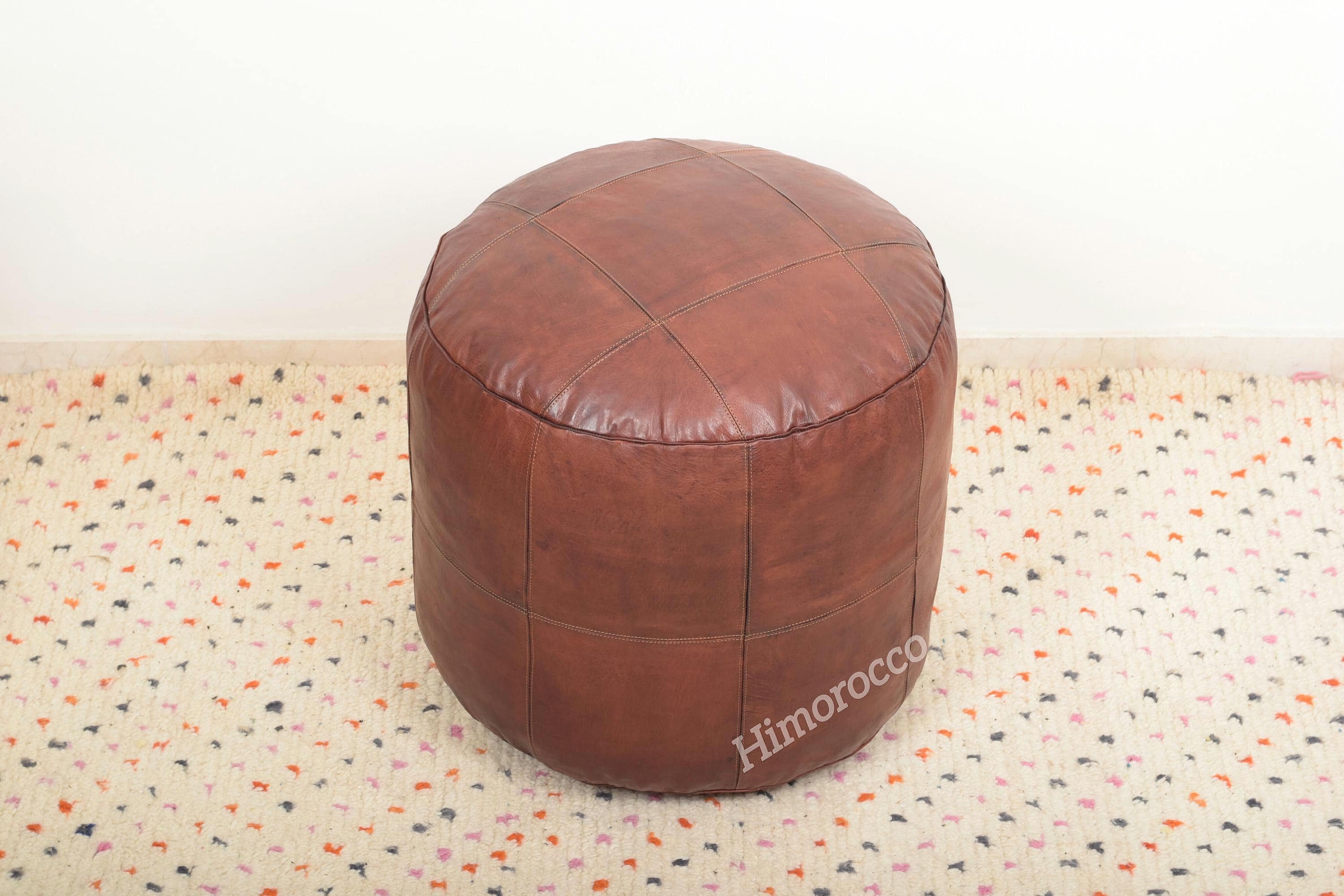 Dark Brown Round Leather Pouf Cover, Moroccan Handmade Round Leathe...