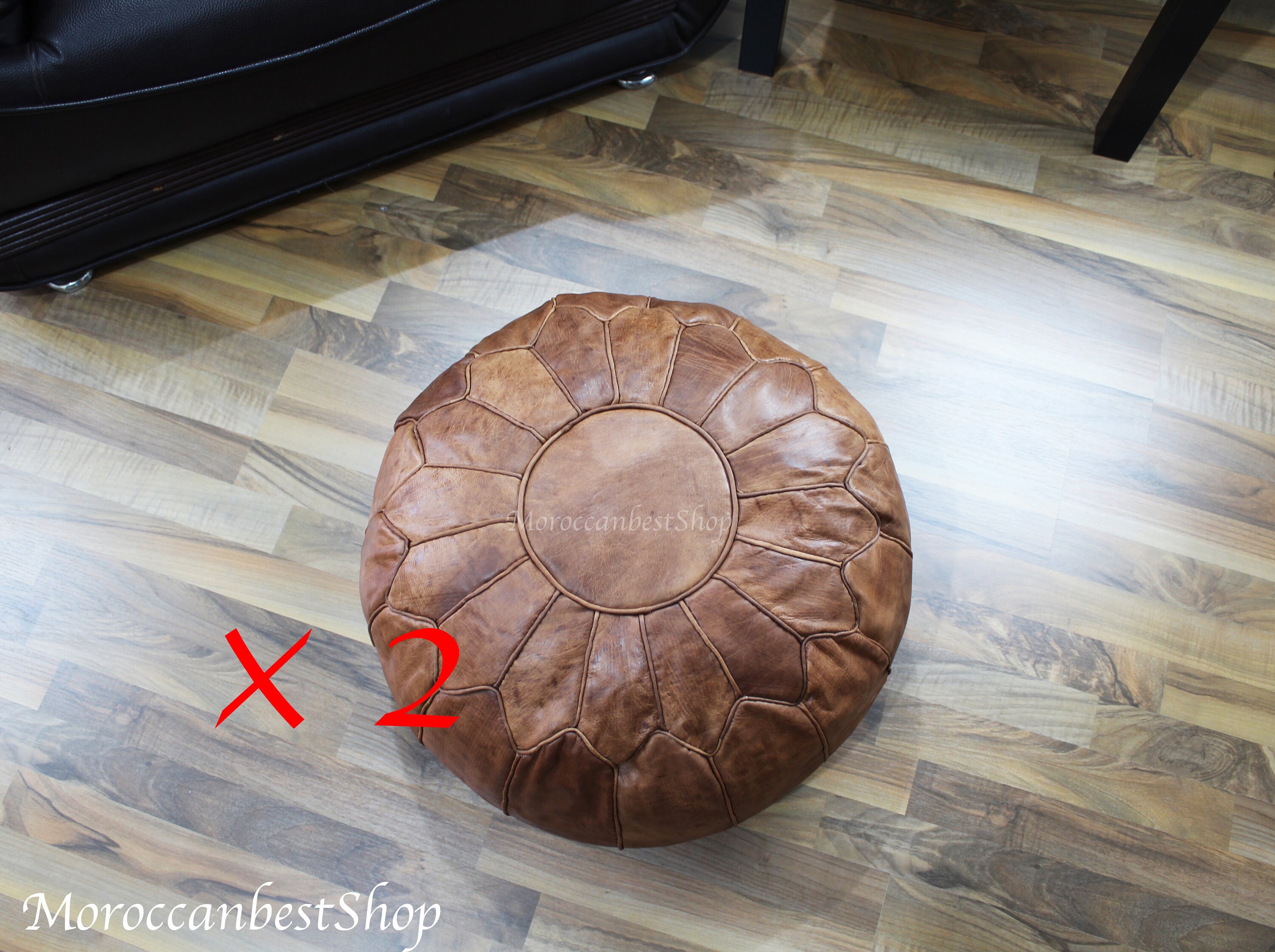Description: Elevate your home with this beautiful set of two handmade Moroccan leather poufs in a r...